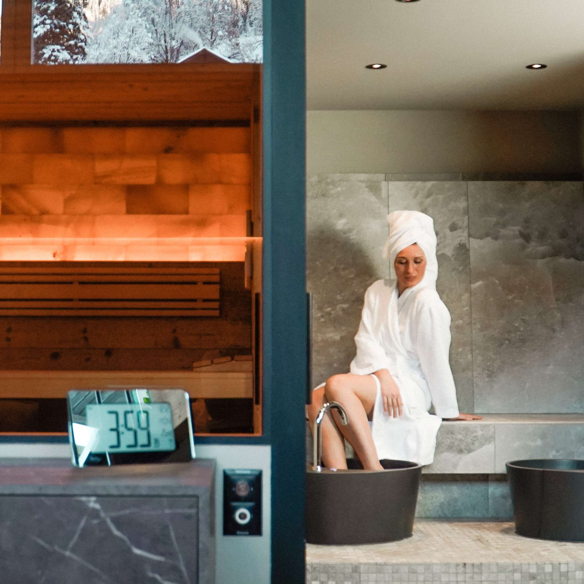 Nach einem erlebnisreichen Tag in den Alpen ist unser gemütlicher Wellnessbereich der perfekte Rückzugsort. Durchflutet von natürlichem Licht, umhüllt von wohltuender Wärme – hier können Sie abschalten, neue Energie tanken und Körper sowie Geist verwöhnen.
