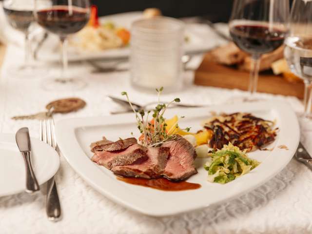 Der helle Raum mit grossen Fensterflächen oder im Sommer die schöne Sonnenterasse schaffen eine offene Atmosphäre mit Blick auf die Bergwelt und die Jungfrau. Klassische Schweizer Küche trifft hier auf moderne Einflüsse und feine internationale Akzente.