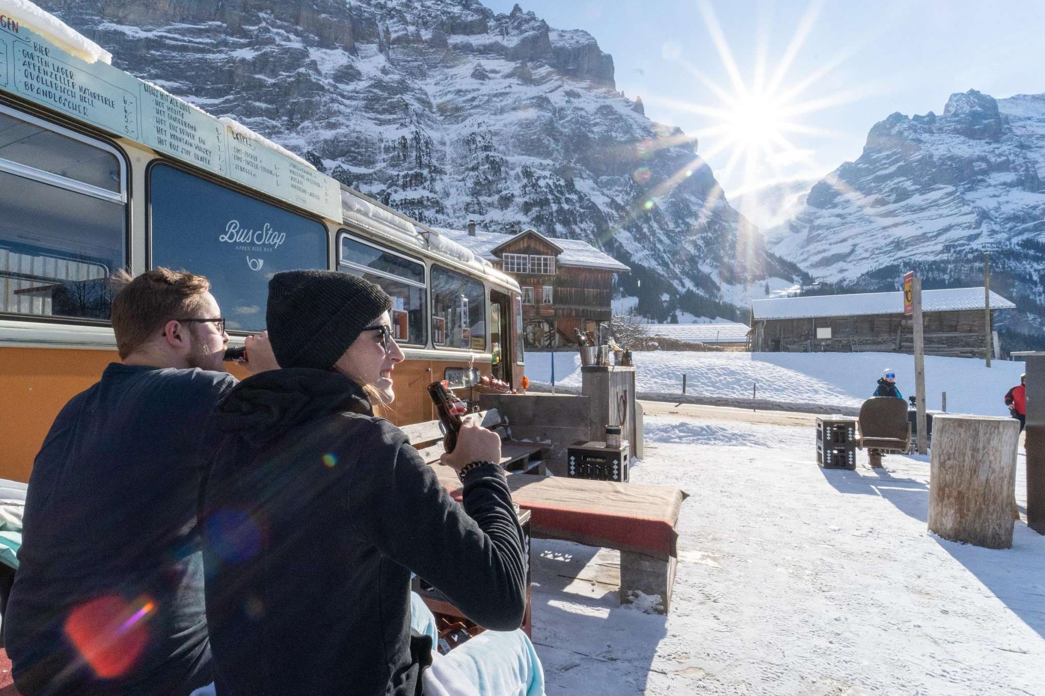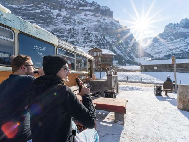 Eine Bar in einem Bus mit Jahrgang 1960. Am Ende der Talabfahrt Grindel fährst du mit den Ski oder dem Snowboard direkt zum Bus Stop. Die Bar ist eine Reise in die Vergangenheit. Eine unverkennbare Atmosphäre mit Charme und Flair. Komm vorbei und probiere den exklusiven Kaffee Motorenöl, eine Gingerbomb oder den heissen Mojito.