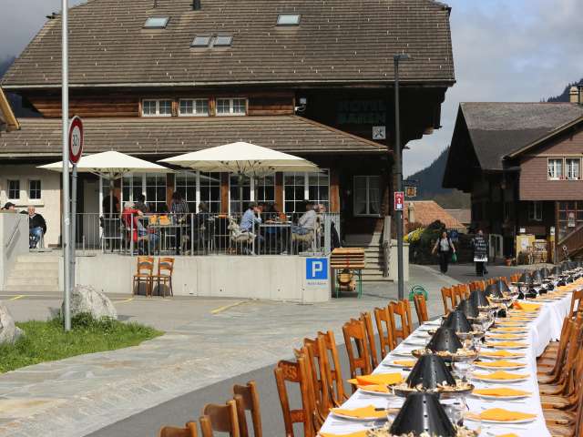 Auch im 2026 hoffentlich wieder draussen! Gemeinsam geniessen wir gegrilltes Fleisch oder Grillkäse vom Tatarenhut, der Bären-Spezialität, auf der Guttanner Dorfstrasse. Dazu gibt es Gemüse, verschiedene Marinaden und Saucen sowie Pommes Frites oder Reis.