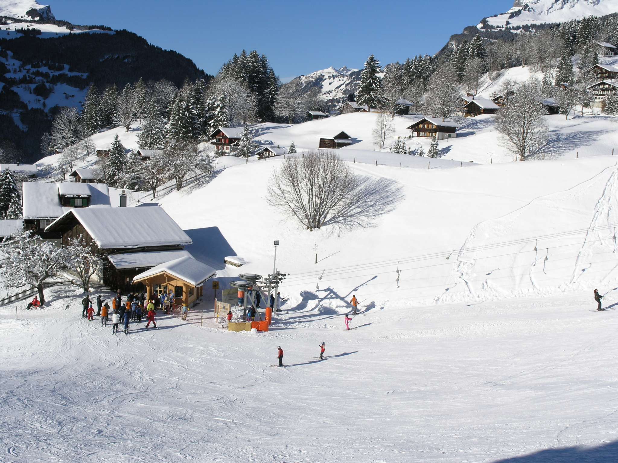 Im Winter: einzigartige Lage mitten im beschneiten Übungsgelände der offiziellen Grindelwald-Ski-Schule! Ski-in Ski-out. Übungs-Lift 70m vor dem Chalet. Vom Chalet-Balkon aus beobachten Sie Ihre Kinder beim Üben. Für ganz kleine Kinder liegt in 200m Entfernung die Bodmi-Arena mit professioneller Kinder-Wintersport-Betreuung. Per Ski erreichen Sie in wenigen Minuten sowohl Grindelwald-Bahnhof (Bahn nach Kleine Scheidegg) und die Talstation der First-Bahn – also die beiden grossen Ski-Gebiete Grindelwalds. Ihr Auto parken Sie in einem der grossen öffentlichen Parkhäuser – Sie werden es während Ihrem Aufenthalt nicht brauchen. Stress-freie Bahn-Anreise wird empfohlen (Gepäckaufgabe). Die Benützung des sehr guten Ski-Bus-Netzes in Grindelwald ist inbegriffen.