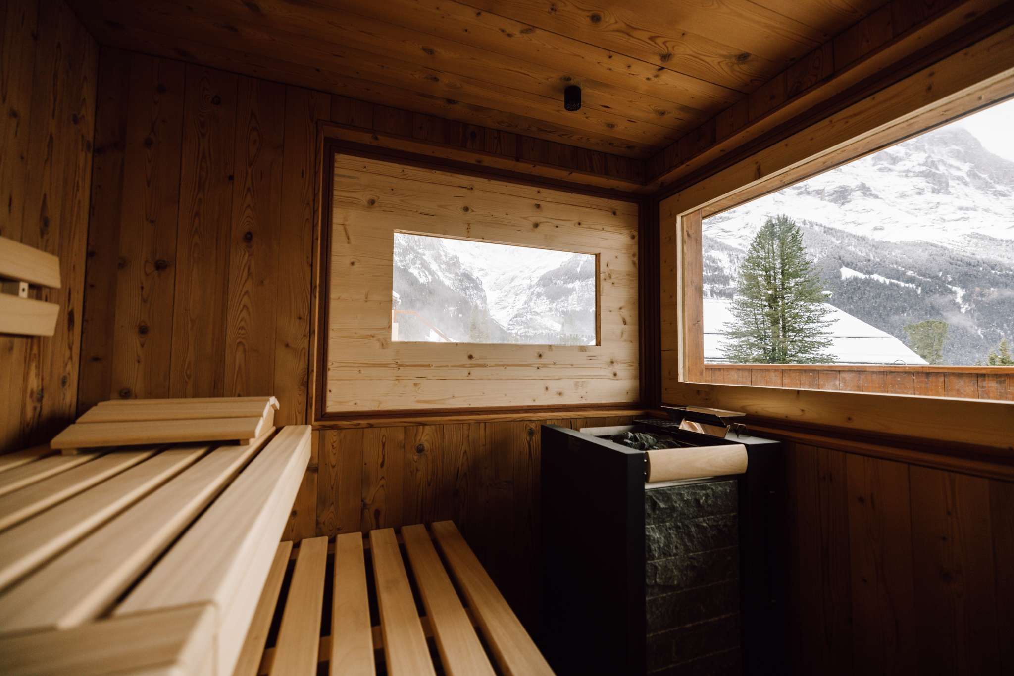 Finnische Sauna mit Panoramafenstern Richtung Eiger und Fiescherhorn und Gletscher