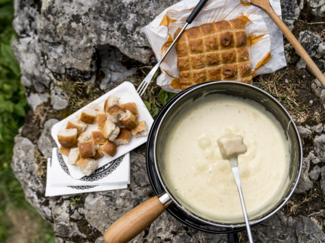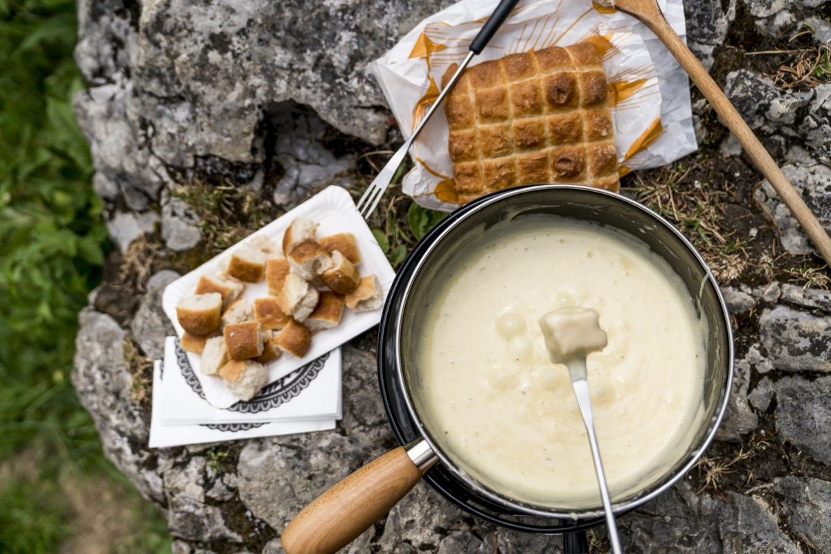Suche dir einen gemütlichen Ort im Freien, bereite das Fondue zu (eine Anleitung dazu ist im Rucksack) und geniesse das feine Fondue.