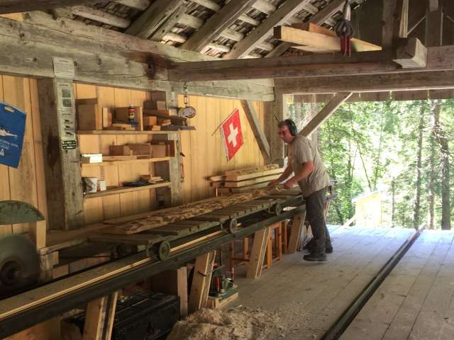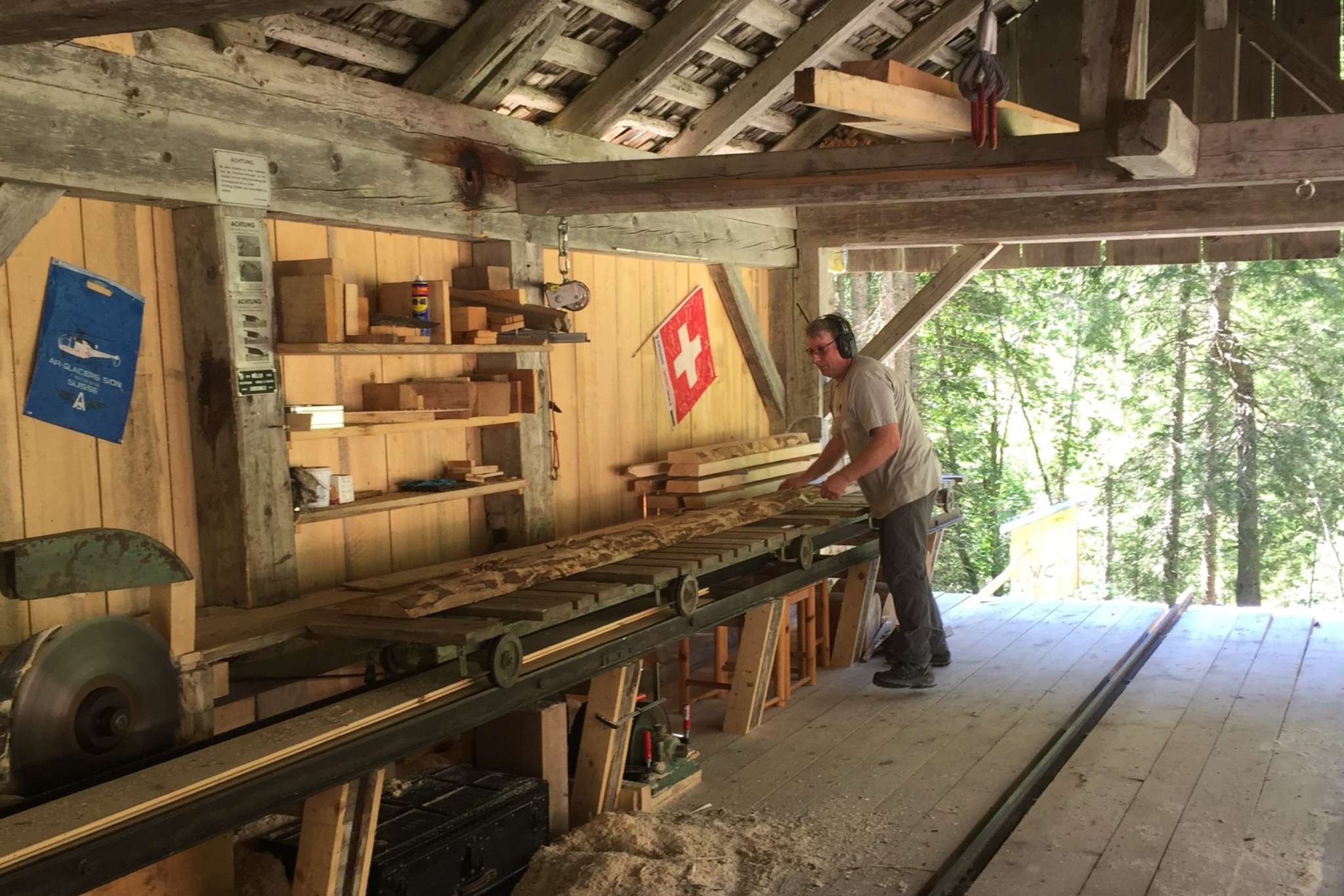 Pure Wasserkraft! Der Besuch der Sagi empfiehlt sich vor allem in Begleitung von Werner Feuz, dem Säge-Experten. Er zeigt, wie das Wasser gestaut und auf die Anlage geleitet wird, wie man den Tremel einspannt, sägt und fräst. In der Sägerei gibt es keinen Strom. Nur mit natürlicher Wasserkraft werden die Baumstämme so zugeschnitten, dass man sie für die Zimmereiarbeiten verwenden kann.