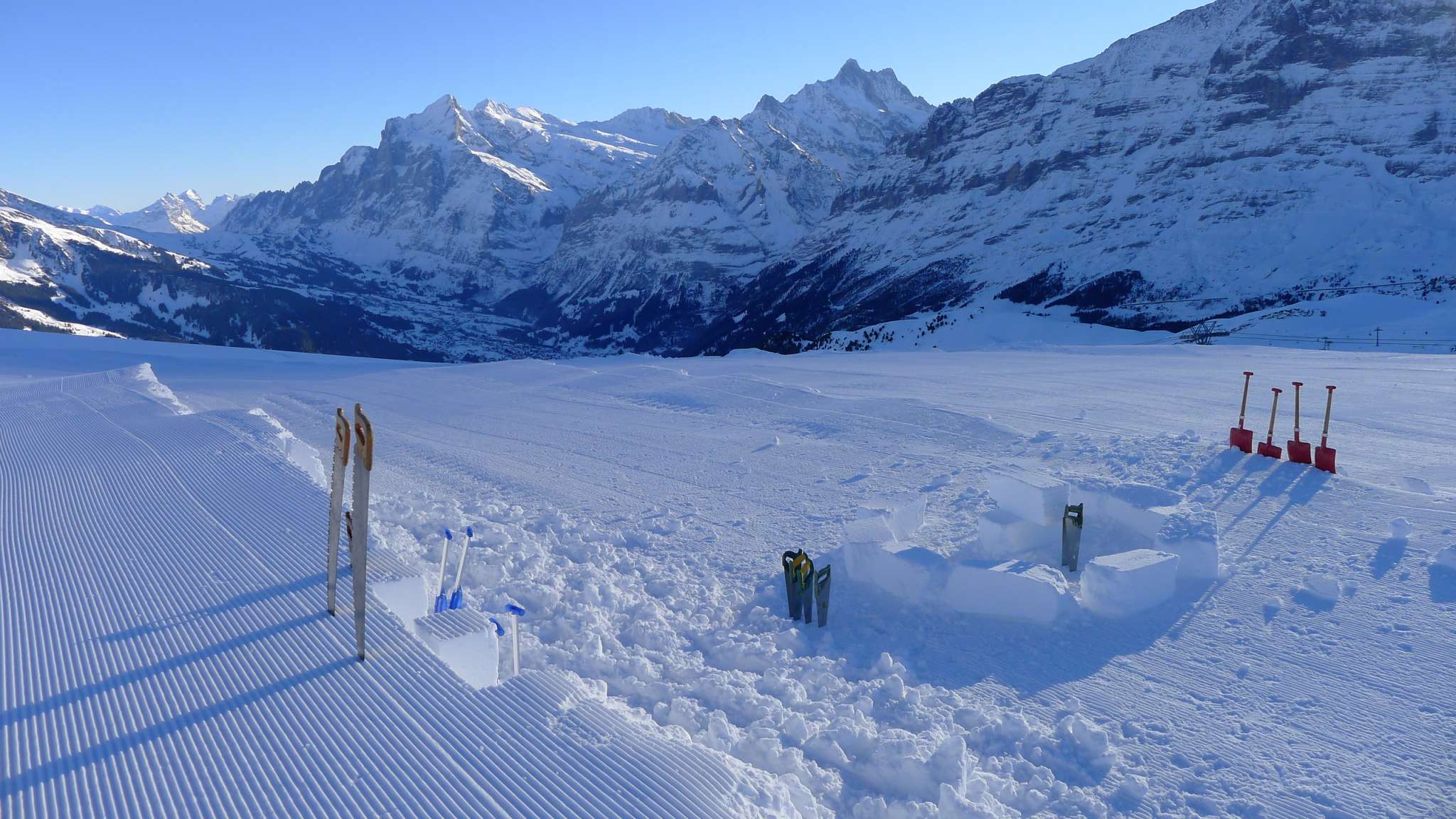 Gemeinsam gelangen wir zu Fuss, mit dem Schlitten oder den Schneeschuhen zu unserem Iglu-Bauplatz in der schneebedeckten zauberhaften Jungfrau Region.