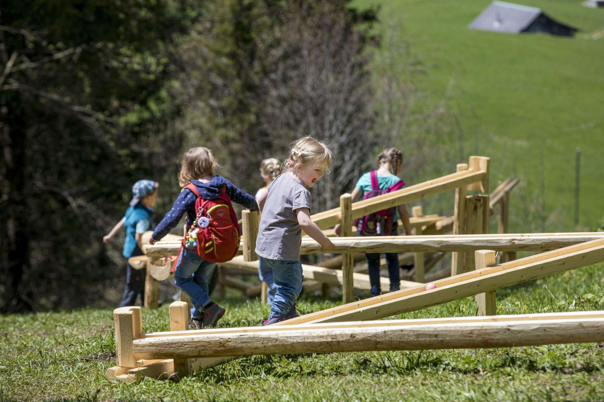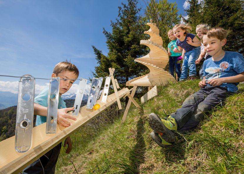 Entlang des Wanderweges von der Mittelstation Bidmi zur Talstation Reuti erwarten dich 12 spannende und abwechslungsreiche Kugelbahnen. Die Bahnen wurden von einheimischen Holzbaufirmen konstruiert. Die reine Wanderzeit von Bidmi nach Reuti beträgt rund eine Stunde. Der Wanderweg ist nicht kinderwagentauglich.
