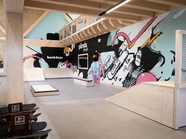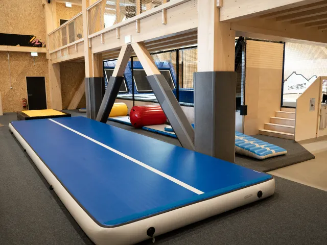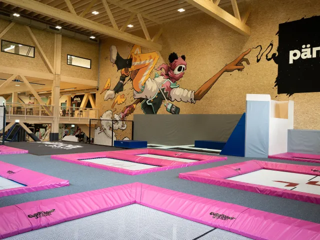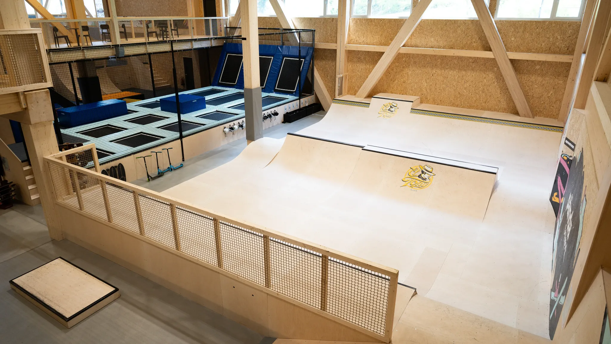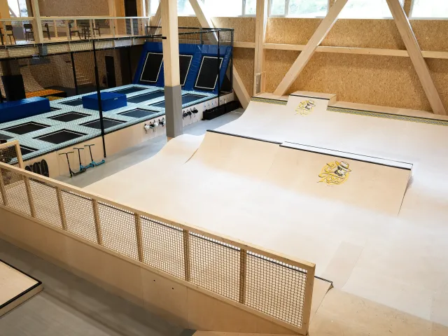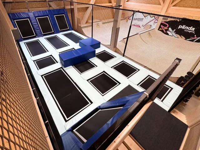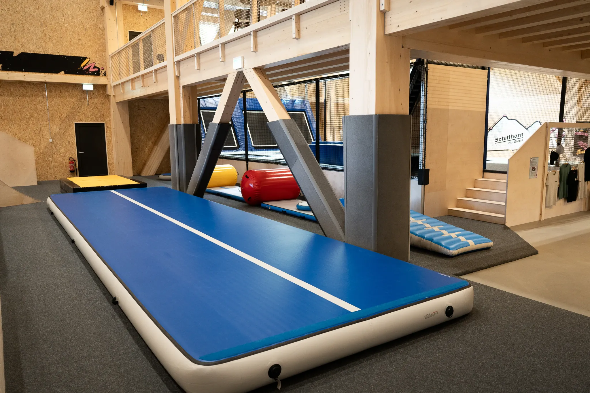 Die moderne, 1'000m² grosse Indoor-Anlage bietet ein vielseitiges Erlebnis rund um Bewegung, Sport und Kreativität. Ob auf den Fivesquare Trampolinen, vom Grandmaster oder Sprungturm in den Airbag, auf dem Airtrack im Multisportbereich oder auf der Skatefläche mit Double-Mini-Ramp, Spine und Extension – hier finden sowohl Einsteiger als auch Fortgeschrittene den perfekten Spielraum zur Entfaltung.