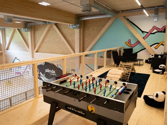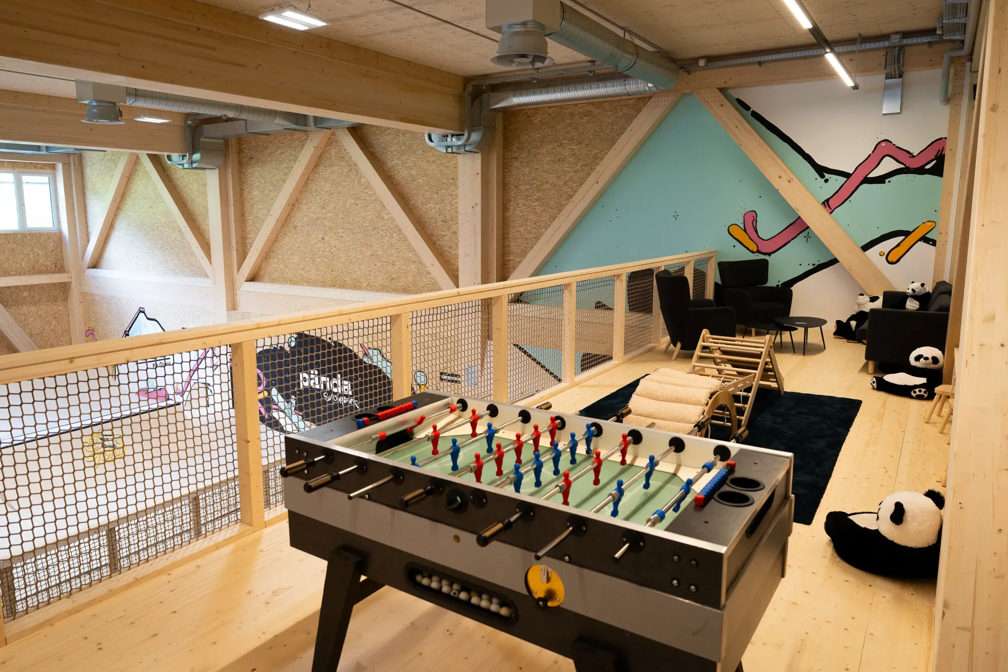 Neben dem Trampolin- und Rollbereich gibt es einen weichen Multisportbereich, der sich ideal für Yoga, Workshops, Parcours und freie Bewegung eignet. Zuschauer geniessen den Überblick über die gesamte Halle von der Galerie aus – inklusive Bistrobereich zum Verweilen. Die Kids toben sich aus, während die Eltern in Sichtweite zurücklehnen können. Hier kommt die ganze Familie auf ihre Kosten.