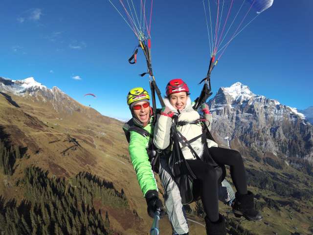 Gemeinsam mit deinem Tandempilot läufst du ein paar Schritte den Hang hinunter und schon schwebst du in der Luft und geniesst die spektakuläre Aussicht auf die Eigernordwand und die Bergwelt der Jungfrau Region.