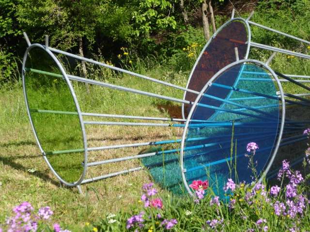 Die ausgestellten Plastiken, vorzugsweise der konstruktiven Richtung, bieten einen spannungsvollen Kontrast zu dieser Idylle und können dank der Modulation des Geländes aus den unterschiedlichsten Blickwinkeln entdeckt werden.