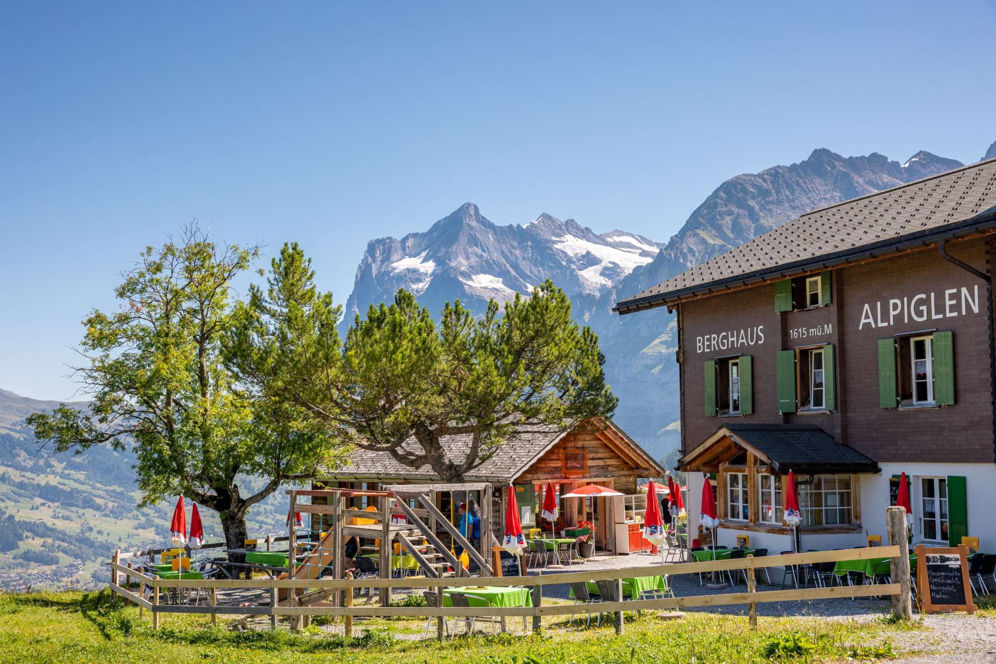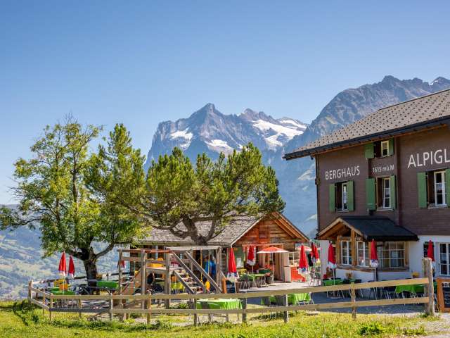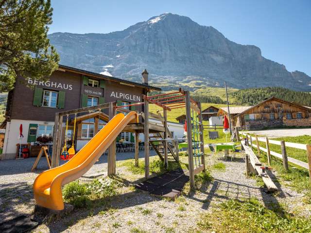 Nach einer langen Wanderung kannst du im Berghaus Alpiglen wieder Kraft auftanken, während sich die Kinder weiter auf dem Spielplatz austoben können. Das Ganze mit einer wunderschönen Aussicht auf die umliegenden Berge.
