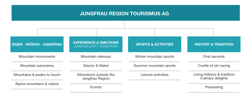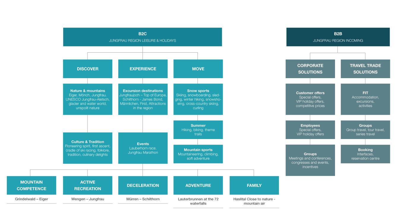 The business areas and thematic areas of the Jungfrau Region are based on its natural features as a destination and the services and attractions it has to offer. The structure of the business areas reflects the DMO strategy. The destination manages five business areas, which are divided into 13 themed areas. Firstly, a distinction is made between direct customers (B2C) and indirect customers (B2B). The five brands operate within these areas and themes as holiday resorts with clearly defined positioning. In the B2C area, there are three business areas and seven themes. In the B2B area, there are two business areas and six themes. Corporate solutions are packages that the Jungfrau Region develops itself. Travel trade solutions include packages organised by third parties.