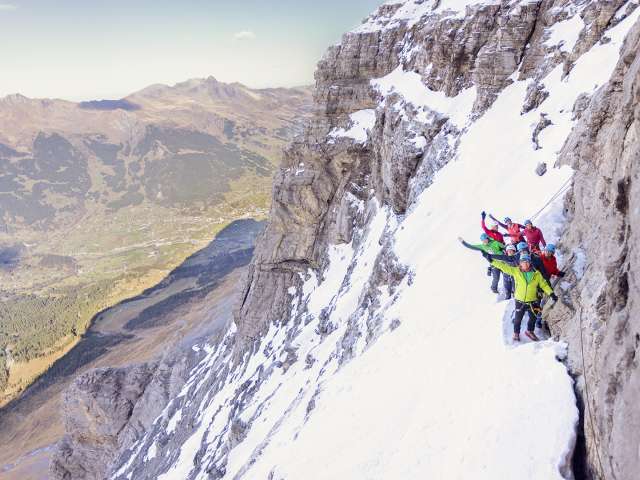 The guides from OUTDOOR will also take the opportunity to tell you all about the dramatic and spectacular first ascent of the Eiger north face and show you what climbing gear from the era was like compared to modern equipment. You’ll be astounded. While perched at an altitude of 2000 meters on the Eiger north face you can then enjoy sipping on a hot beverage while taking in the stunning views of the Grindelwald valley 600 meters below. After your unforgettable excursion through and on the Eiger north face, you’ll have the possibility to continue on to the Jungfraujoch by rail and/or take a gondola back to Grindelwald.