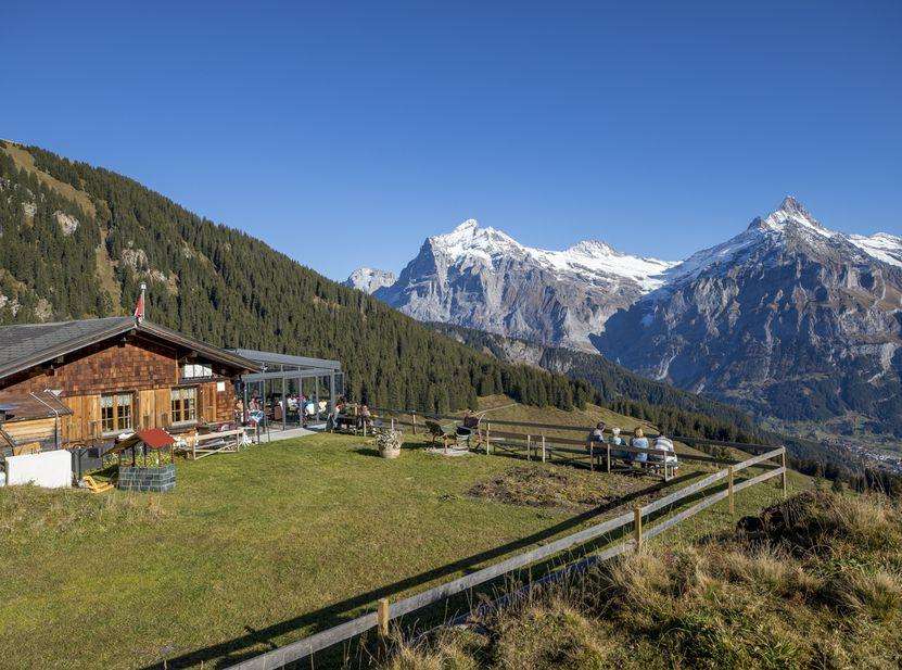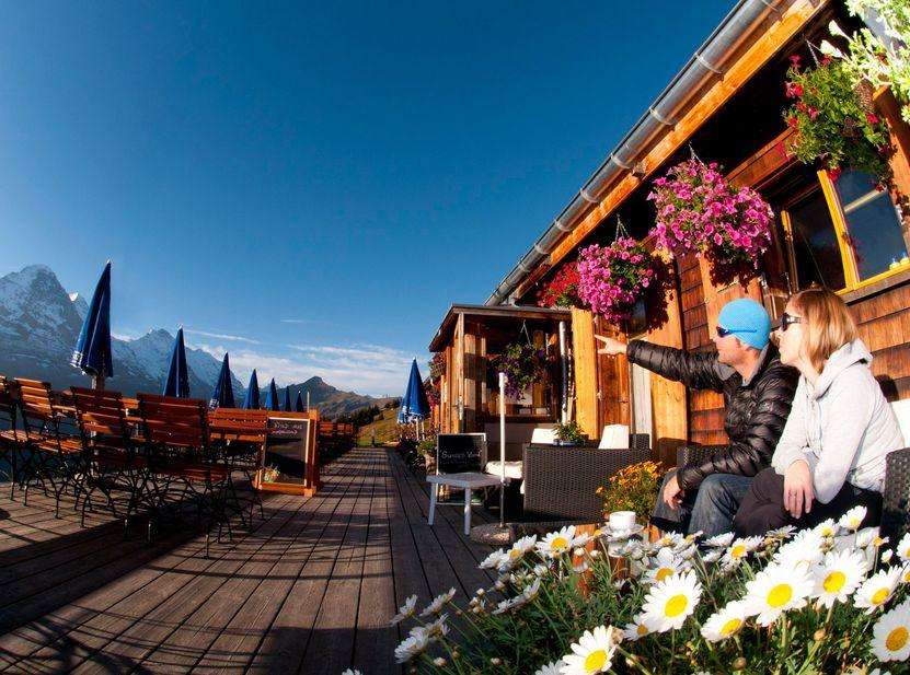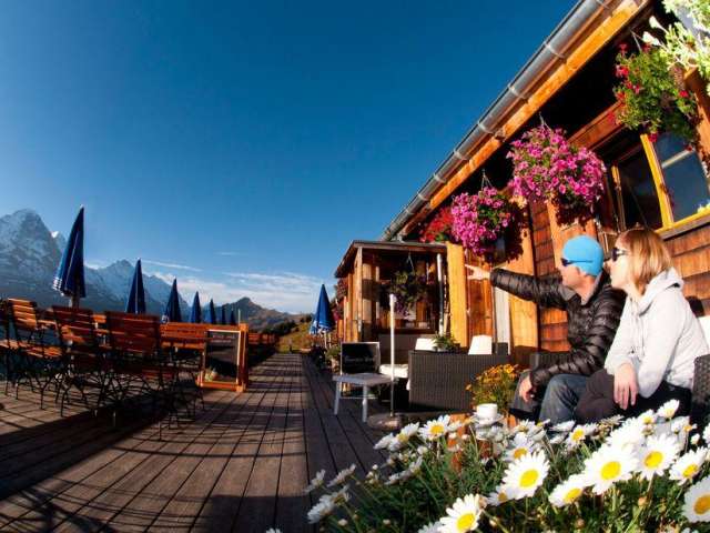 The cosy mountain restaurant with its large sun terrace and unique panorama of the Eiger, Mönch and Jungfrau is located on the Bussalp (1800 m above sea level).