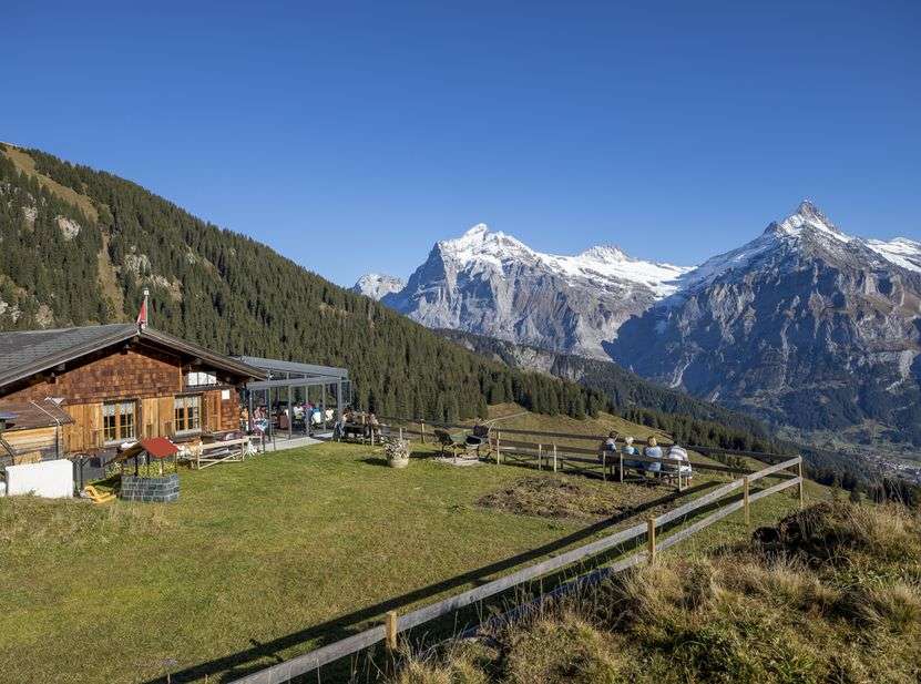 The Bussalp mountain restaurant offers a large terrace with breathtaking panoramic views, an AlpLounge with couches and a sunbathing lawn. After a long hike, you can unwind in the deckchairs and relax your feet in a Kneipp bath. And of course, the sunset against the backdrop of Grindelwald's magnificent mountains is best experienced here in a cosy atmosphere, accompanied by traditional hut dishes and culinary excursions through the region's mountain world.