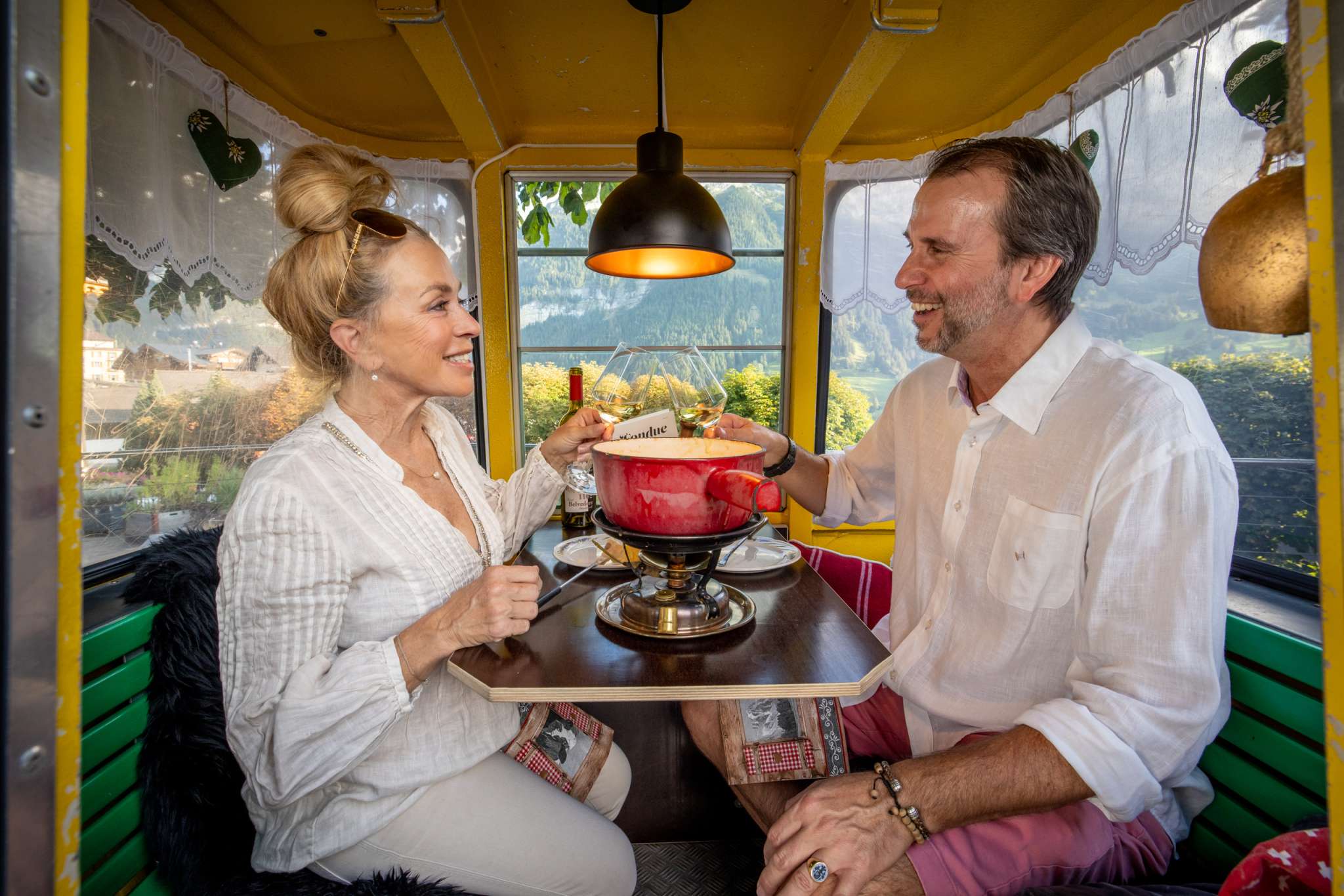 Simply to melt away: classic Swiss cheese fondue, served outdoors in the cosy gondola at the Hotel Belvedere Grindelwald. So don't forget to put on warm clothes in winter.