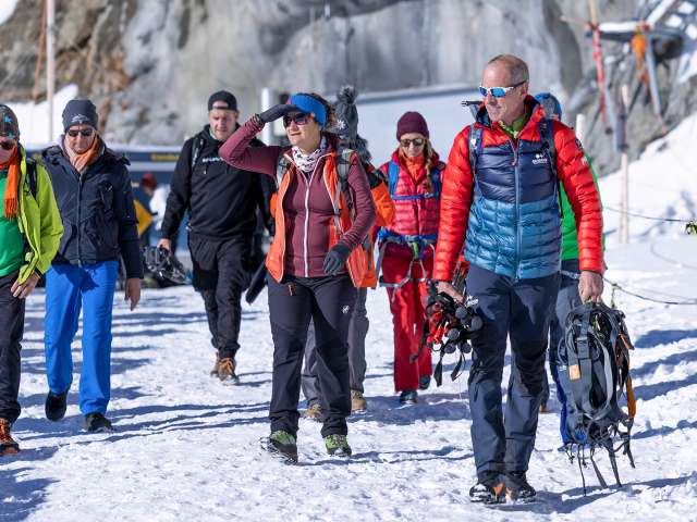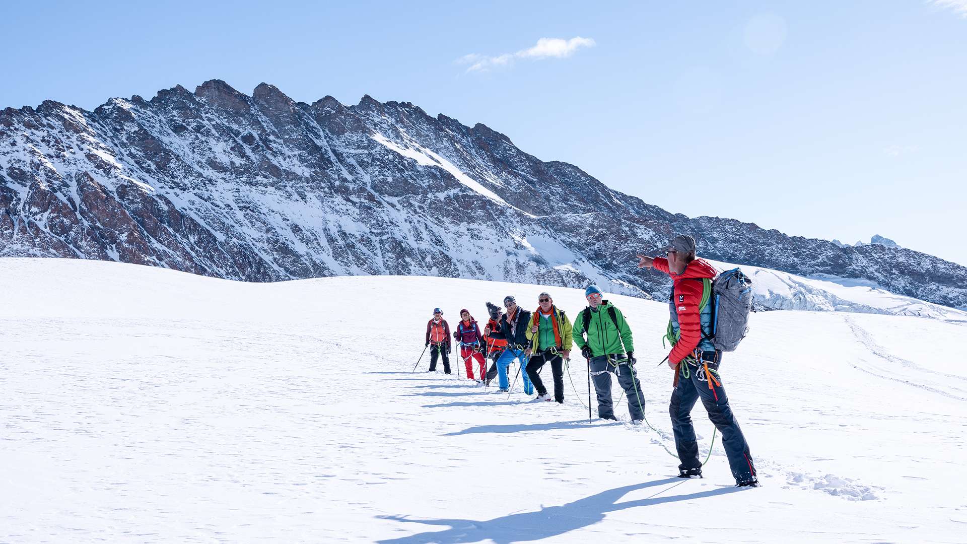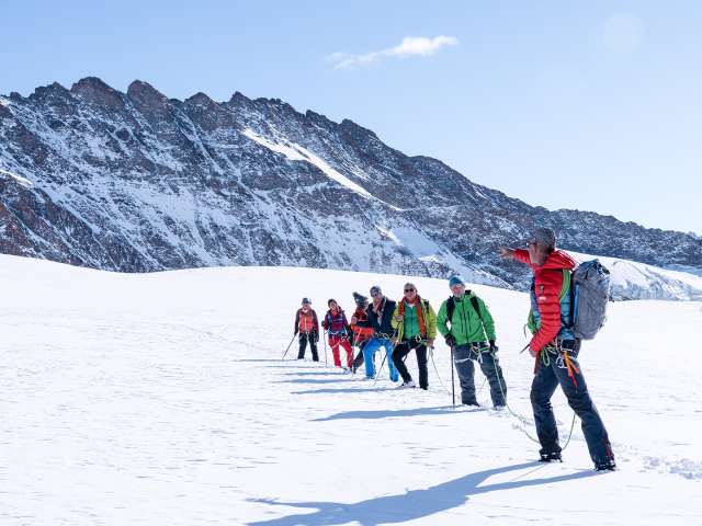 For this special adventure, we will pick you up at the meeting point and then continue on to the Jungfraujoch at 3,454 meters above sea level – the highest railway station in Europe! After roping up and putting on our helmets, our IVBV mountain guides will skillfully guide you across the glacier, ski pole in hand. They look forward to sharing their wealth of experience and general knowledge of the mountainous topography and specific mountaineering expertise throughout the day. The distance and pace of the glacier tour can be adjusted to the specific goals and abilities of your group.