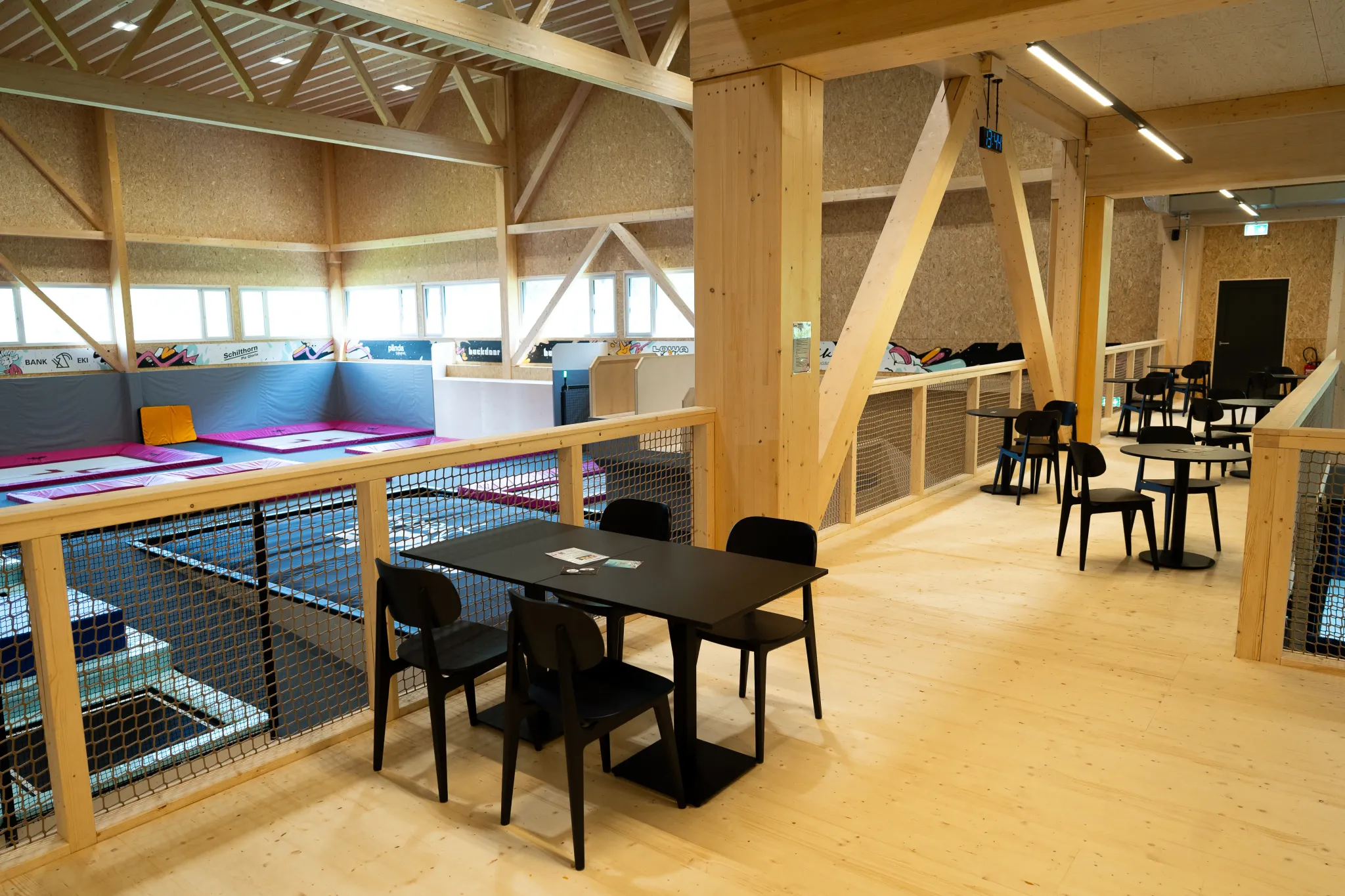 In addition to the trampoline and skating areas, there's a soft multisport zone ideal for yoga, workshops, parkour, and free movement. Spectators can enjoy a full view of the hall from the upper gallery, which includes a cozy bistro area. Kids can go all out while parents relax within sight. There’s something for the whole family to enjoy.