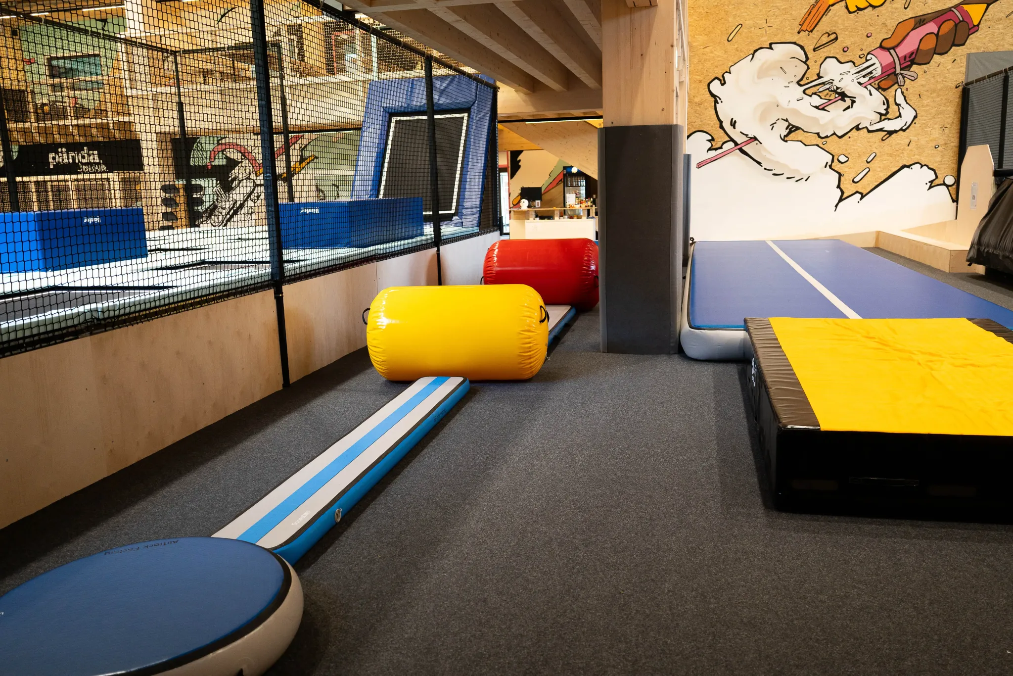 This modern 1,000 m² indoor facility offers a diverse experience centered around movement, sport, and creativity. Whether it's on the Fivesquare trampolines, jumping from the Grandmaster or tower into the airbag, on the Airtrack in the multisport area, or skating on the surface with double mini ramp, spine, and extension – both beginners and advanced athletes will find the perfect playground to express themselves.