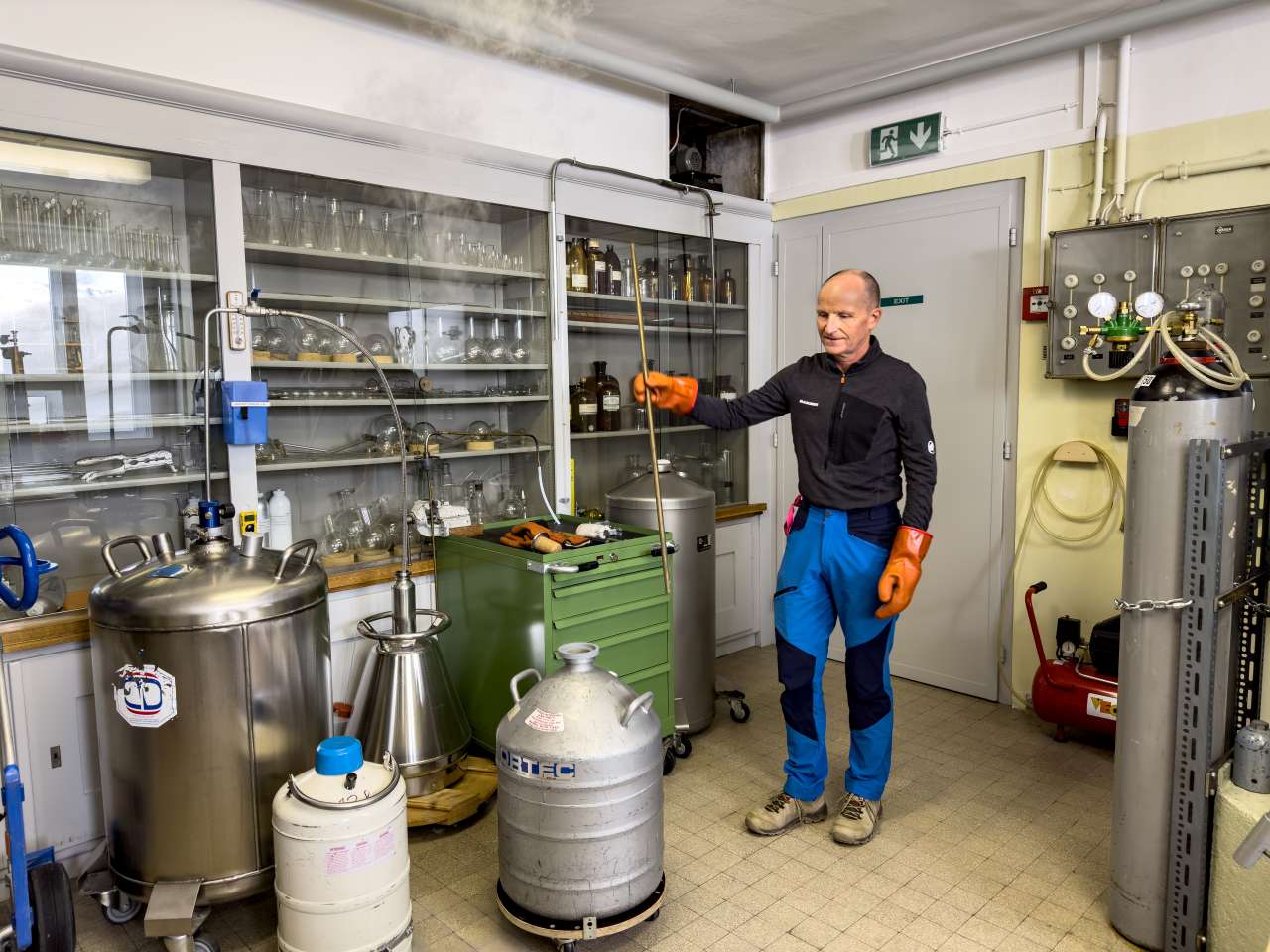 Nous suivons Thomas Furter pas à pas. Avec tous ces couloirs, escaliers, portes et galeries, nous nous perdrions assez rapidement. Il nous montre l'un des cinq laboratoires. Ici, il prélève manuellement des échantillons de radioactivité. Depuis des décennies, deux isotopes radioactifs (carbone 14Cet gaz rare krypton 85Kr) sont mesurés à l'aide de deux structures de mesure simples. Ces mesures servent à surveiller l'atmosphère. Juste à côté, il fabrique de l'azote liquide. Pour cela, l'azote de l'air est liquéfié à -196°C, avec une installation datant des années 1960. L'azote liquide est nécessaire pour deux expériences, notamment pour obtenir les isotopes radioactifs Krypton 85Kr. Nous écoutons avec attention ses explications.