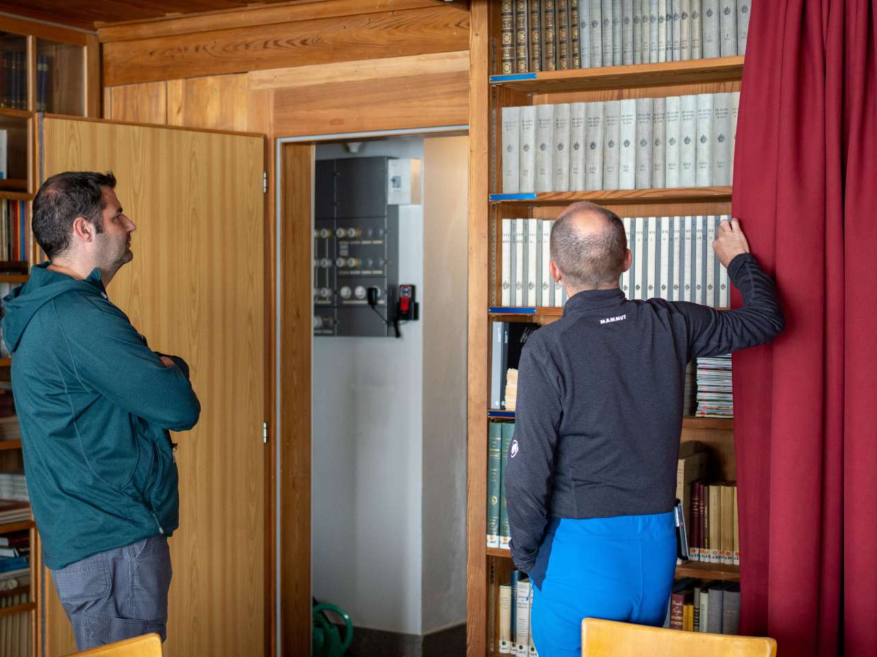 Thomas Furter est responsable des projets de recherche, de l'entretien technique et de l'infrastructure. Son travail commence souvent à 6 heures du matin - en pelletant la neige sur le Sphinx. «Un mètre et demi de neige fraîche - cela peut arriver en hiver», raconte l'homme de 55 ans. Et oui, à presque 3500 mètres d'altitude, il neige aussi en été. «Malheureusement, ce n'est plus aussi fréquent qu'avant. En raison du réchauffement climatique, les précipitations descendent aussi souvent sous forme de pluie en été». L'avant-toit de son appartement dans la station de recherche doit aussi être régulièrement déneigé, attaché à une corde. Pas aujourd'hui. En général, c'est calme en ce mercredi matin. «Il y a des jours où nous travaillons 12 heures. Mais il y a aussi des jours où j'ai le temps de lire tranquillement un livre», dit Sonja Stöckli. Mais revenons à notre travail. Deux à trois fois par semaine, ils guident des groupes de visiteurs en allemand et en anglais à travers la station de recherche et le Sphinx. Aujourd'hui, nous bénéficions d'une telle visite exclusive. Il faut monter les escaliers, c'est assez fatigant à cette hauteur. Je dois passer à la vitesse inférieure. Notre objectif est le quatrième étage, la bibliothèque. Ici, il y a - bien sûr - beaucoup de livres. Et des enregistrements de recherches remontant jusqu'au 19ème siècle.