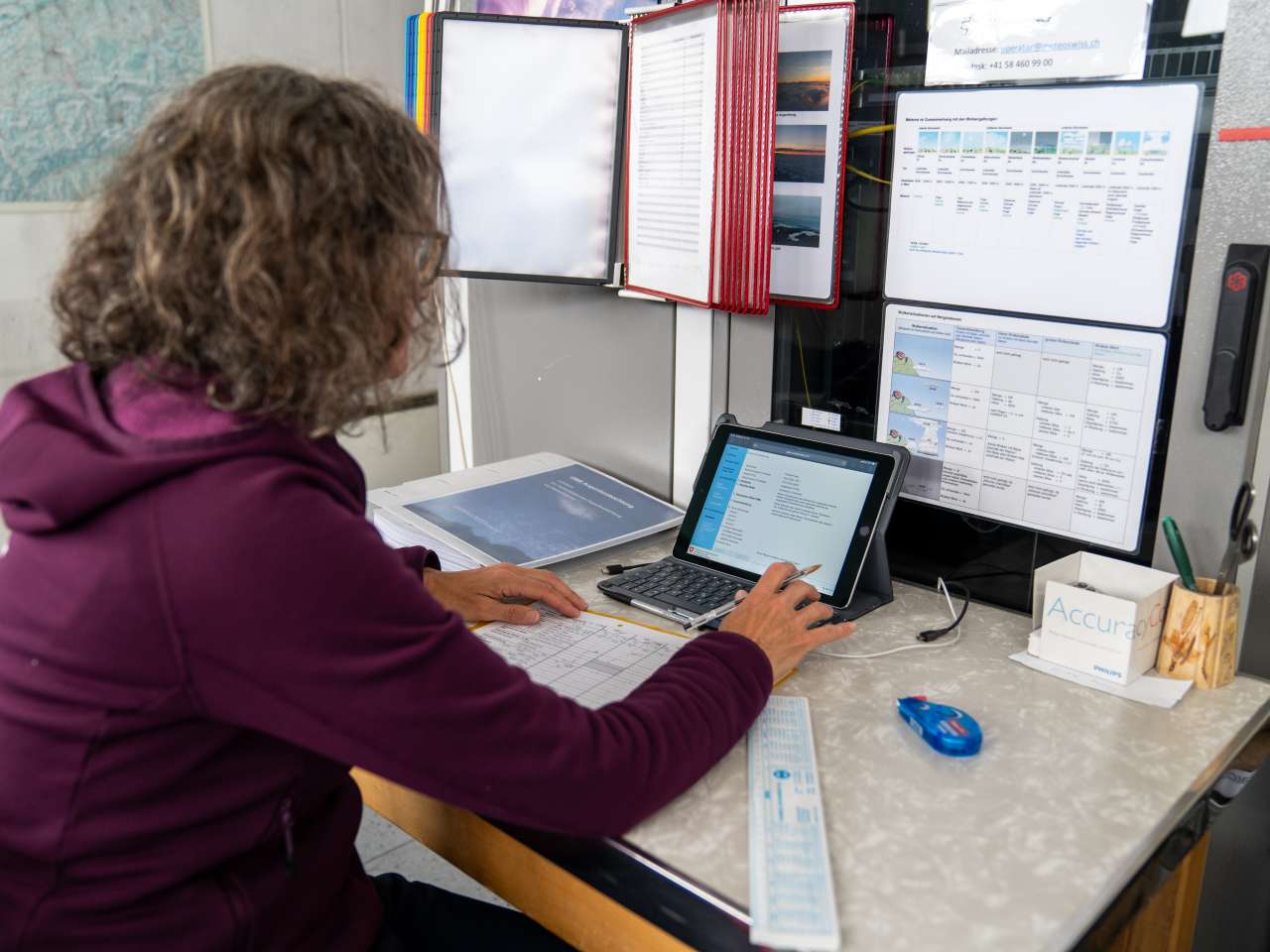De retour à l'intérieur du Sphinx, Sonja Stöckli saisit soigneusement ce qu'elle a observé sur la tablette. En cas d'incertitude, elle ou Thomas Furter peuvent utiliser les jumelles.