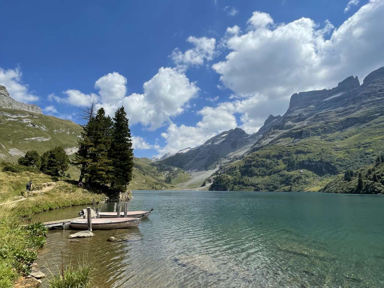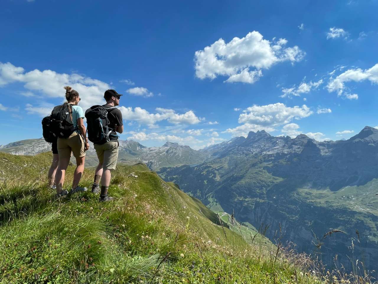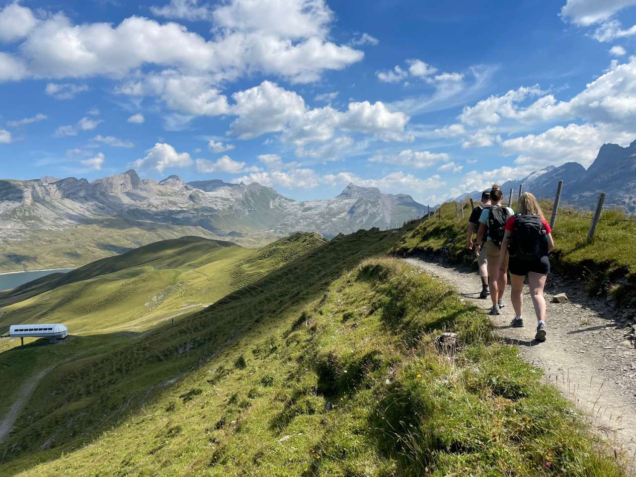 Le long du chemin de l'horizon, nous nous approchons ensuite pas à pas du lac Engstlensee. Le panorama de montagnes - du Titlis au glacier Trift jusqu'au monde du Grimsel et plus loin au Wetterhorn - est fantastique. Le chemin bien aménagé porte bien son nom. Il serpente plus ou moins à plat le long d'un flanc de montagne. Juste avant le Balmeregghorn, nous avons quand même quelques mètres de dénivelé à grimper. Nous sommes récompensés de nos efforts par la vue sur le Melchsee et le Tannensee. Nous nous accordons une petite pause. Ensuite, nous descendons avec une légère inclinaison vers le Tannensee et continuons vers Tannalp. Un restaurant accueillant se trouve de manière tentante au bord du chemin, mais nous continuons notre randonnée - avec l'Engstlenalp comme objectif - sans nous arrêter. La descente vers l'Engstlenalp commence. Certains passages longent une falaise abrupte. Mais le sentier de randonnée super aménagé avec des cordes de retenue nous permet de passer cet endroit sans problème. Nous traversons quelques petits ruisseaux, observons des marmottes dans les prairies verdoyantes et passons finalement devant un ensemble idyllique de fromageries. La Suisse à l'état pur ! Et puis le lac bleu t'attire déjà. Heureux, après cette belle randonnée, nous nous asseyons sur la rive et profitons de la nature fantastique. Plus tard, à la fromagerie de démonstration Engstlenalp, nous nous offrons une délicieuse glace Hasli et achetons du fromage d'alpage local. Si nous avions été là le matin, nous aurions même pu assister à la production du fromage. Mais peu de temps après, nous prenons le bus de l'Engstlenalp à travers le Gental jusqu'à Innertkirchen - et ensuite le train pour retourner à Meiringen.