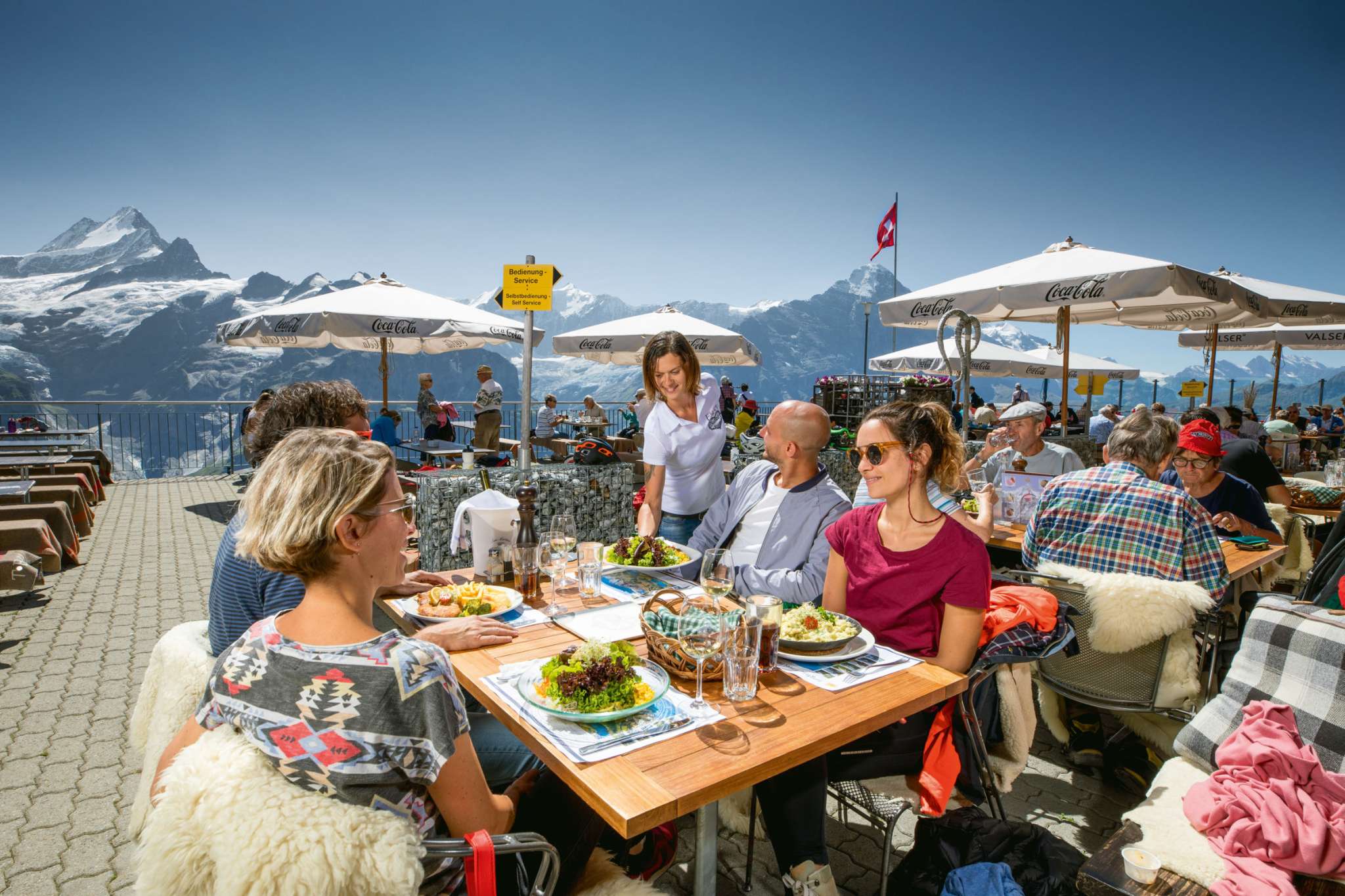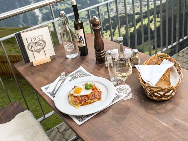 Juste à côté de la station de télécabine First, à 2200 mètres d'altitude, se trouve l'auberge de montagne First avec sa vue imprenable sur les montagnes environnantes. Sur la terrasse ensoleillée et dans le restaurant, tu dégusteras toute la journée des plats délicieux.