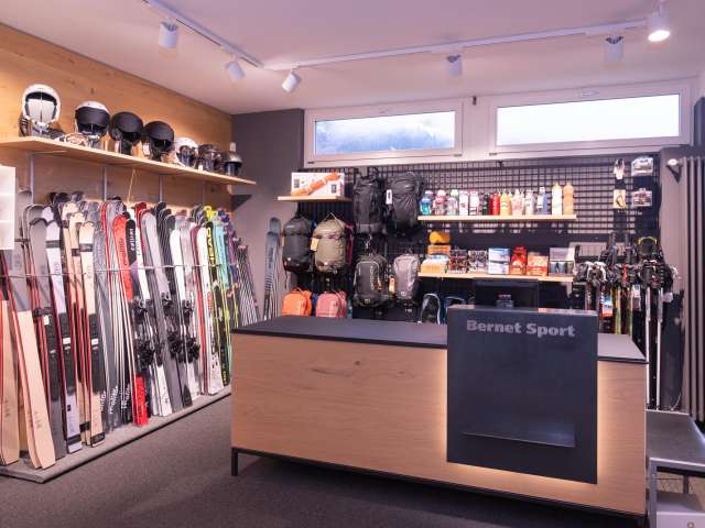 Au sous-sol t'attend un choix soigneusement sélectionné de chaussures et d'articles de sport des marques Head, Molitor (made by Stöckli) Atomic, Van Deer, Kessler, Tecnica, Fischer etc. ainsi que notre service de location et de maintenance.