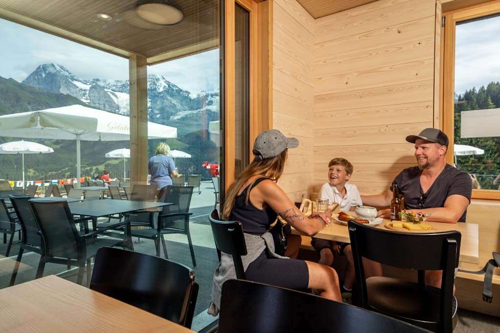 Qu'il s'agisse d'une excursion de randonnée détendue ou d'une descente de montagne variée en VTT : une petite pause fait toujours du bien. Directement sur le toit de la station de téléphérique de Grütschalp, le charmant bistrot invite à la détente. Il sert de point de départ pour des randonnées panoramiques et un trail freeride pour les vététistes* expérimentés. Toute l'année, tu seras choyé ici avec une offre petite mais bien pensée de snacks et de boissons - ainsi qu'une vue à couper le souffle sur les trois sommets Eiger, Mönch et Jungfrau. Ici, on aime rester assis un peu plus longtemps.