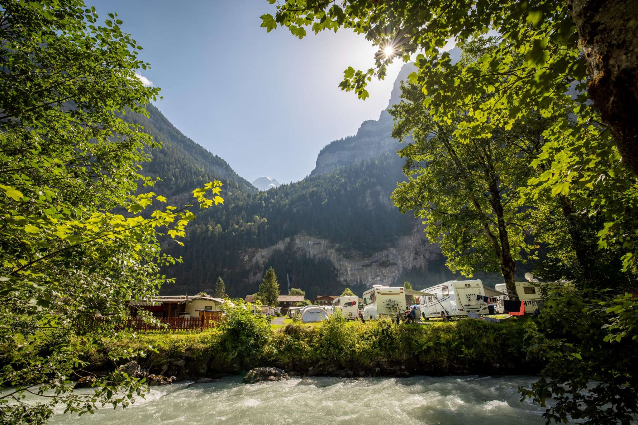 Un site exceptionnel se trouve à seulement 5 minutes à pied de notre camping : les chutes de Trümmelbach. Ces cascades glaciaires uniques, situées à l'intérieur de la montagne et accessibles par un ascenseur dans un tunnel, sont un incontournable de votre séjour à Stechelberg.
