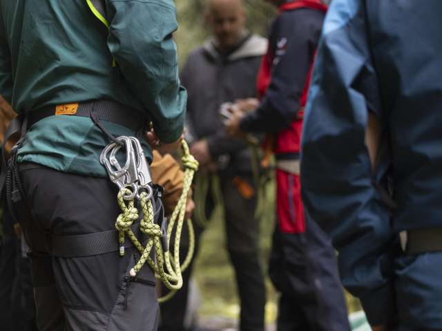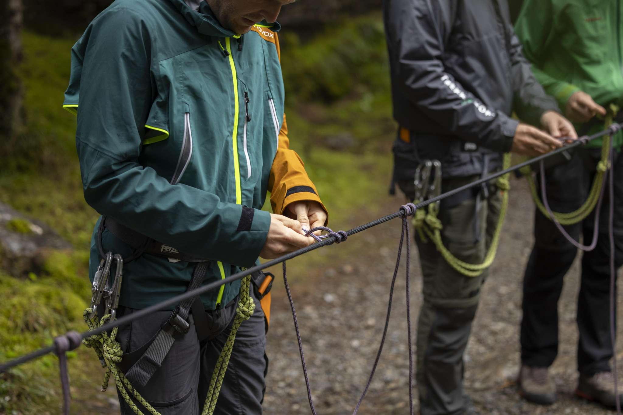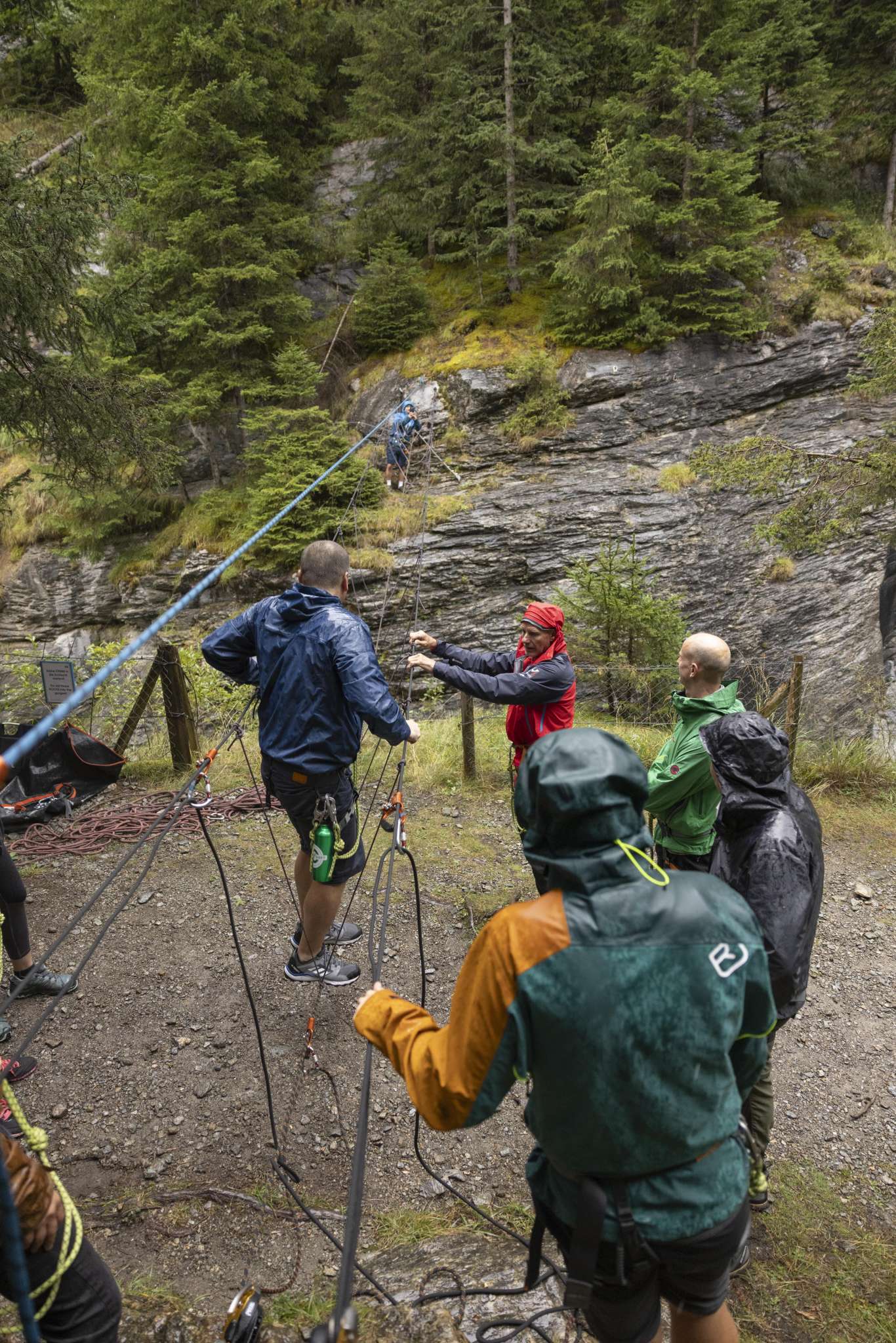 Tu n'as pas encore assez d'aventures en montagne? Cela fait longtemps que tu es tenté de traverser une paroi rocheuse à la verticale? En complément de la construction d'un pont de cordes, il est possible, surtout pour les grands groupes, de s'initier à l'escalade sur rocher ou de faire une impressionnante descente en rappel sur la paroi rocheuse de la gorge du glacier. Ce point supplémentaire du programme nous permet d'éviter des temps d'attente plus longs en doublant notre programme pour vous. Pour l'offre "escalade et descente en rappel", tu seras guidé et encadré de manière compétente par des guides de montagne d'OUTDOOR.