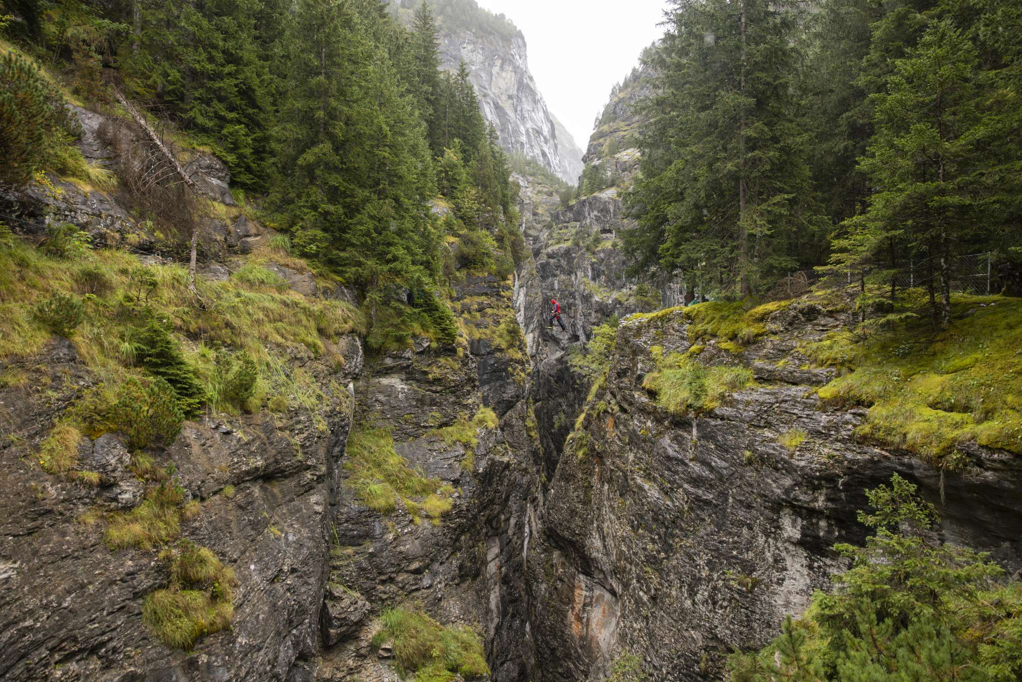 Nous arrivons à la gorge du Glacier inférieur de Grindelwald à pied, en car ou en bus local. Nous nous mettons tout de suite en route pour admirer la gorge du glacier d'en haut, ce qui implique une courte randonnée. Instruits avec compétence par nos guides de montagne IVBV, tu noueras un pont avec des cordes individuelles, qui sera ensuite tendu au-dessus de la gorge en unissant tes forces. Le pont tiendra-t-il ? Tu auras certainement besoin d'un peu d'adrénaline et de courage pour franchir le ravin sur le pont que tu as construit. Une fois le travail terminé, tu apprécieras certainement une boisson que tu auras apportée dans ton sac à dos et tu discuteras de tes exploits. Ensuite, une visite des gorges du glacier s'impose. Cela te permettra d'avoir une vue impressionnante et opposée d'en bas, sur une passerelle sécurisée, sur les parois rocheuses qui s'élèvent très haut et sur les moulins glaciaires qui se sont formés au fil des siècles.