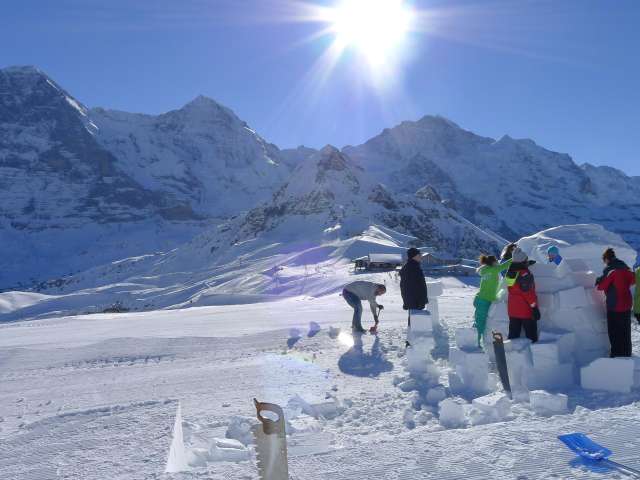 Sous la direction experte de vos guides OUTDOOR, vous construisez bloc par bloc votre propre igloo. L'art de la construction des Inuits exige de l'endurance, de la précision et de la coopération. Nous commençons par scier les différents blocs de neige dans le champ de neige compact préparé par une dameuse. Ensuite, nous posons les blocs de neige les uns sur les autres en cercle et de plus en plus étroitement vers le haut jusqu'à la fermeture du dôme d'igloo. Tout en dégustant une boisson chaude, vous pourrez échanger vos connaissances nouvellement acquises. Un apéritif et/ou un dîner complèteront votre expérience OUTDOOR dans la région de la Jungfrau.