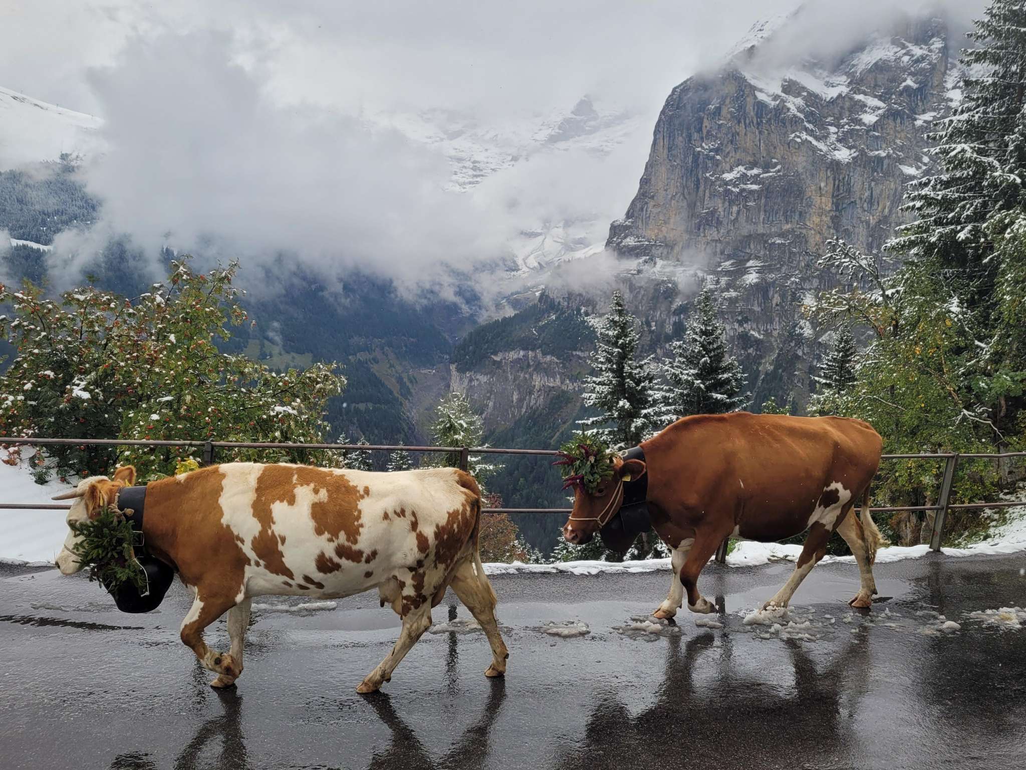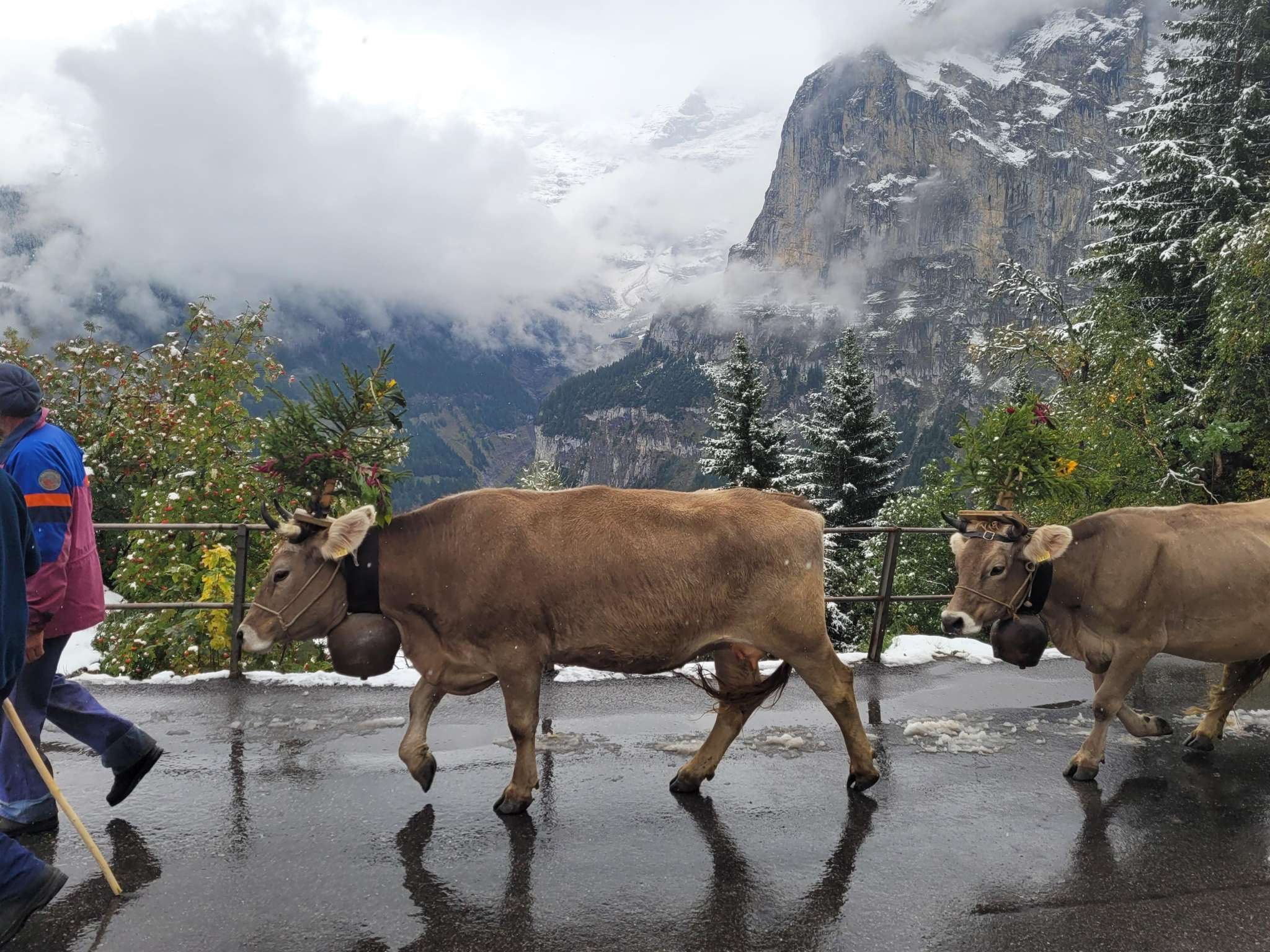 Les vaches et les bergers qui ont passé tout l'été sur le Schiltalp retournent dans la vallée et traversent Mürren vers midi.