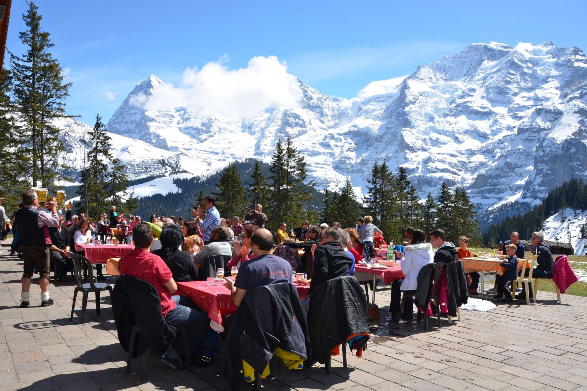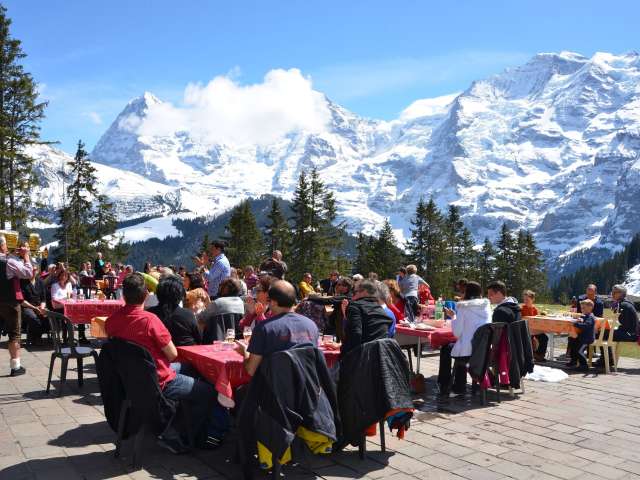 Au milieu d'une nature intacte, la gastronomie en self-service est ici une tradition et offre une grande variété de plats. Tu trouveras de la place sur la terrasse comme à l'intérieur du restaurant. D'ici, tu as la meilleure vue sur les trois sommets Eiger, Mönch et Jungfrau.
