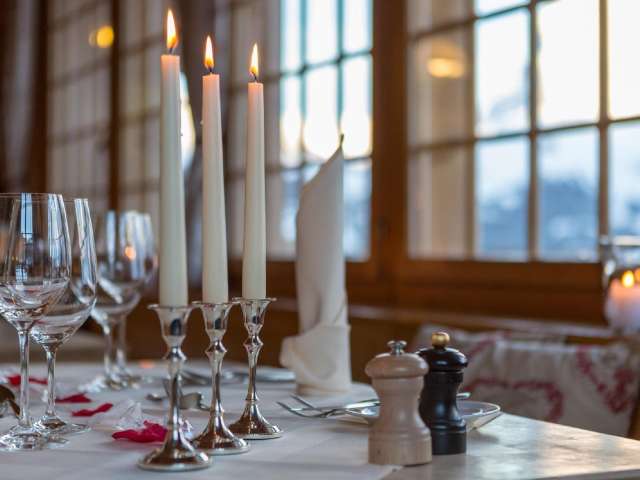 Le restaurant Alpenruh est l'un des endroits les plus confortables de Mürren. Non seulement en été, mais aussi en hiver, les clients aiment s'y blottir dans les douces couvertures de la terrasse ensoleillée. Lorsque le soleil s'est couché et que le rouge du soir sur l'Eiger, le Mönch et la Jungfrau s'estompe, un changement dans la salle de restaurant s'impose.