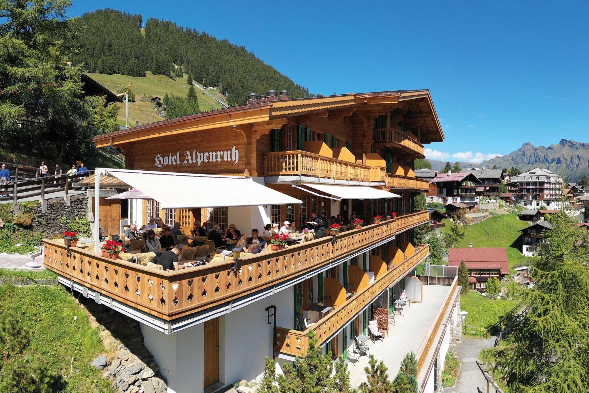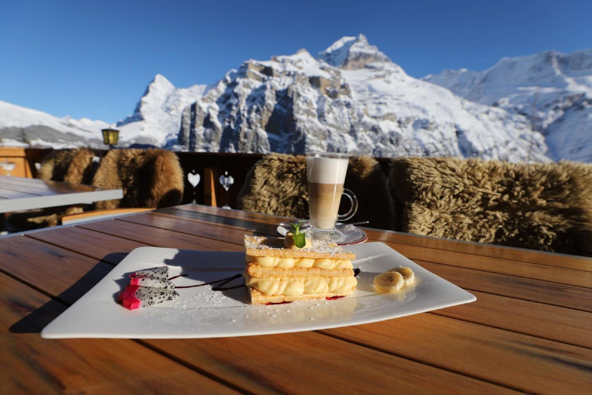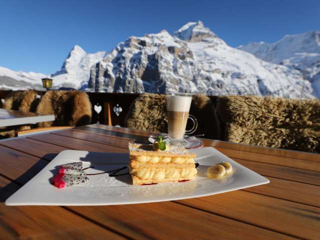 Le restaurant se trouve juste devant la station Mürren du téléphérique Schilthorn - l'endroit idéal pour faire une pause pendant une journée de randonnée ou de ski.