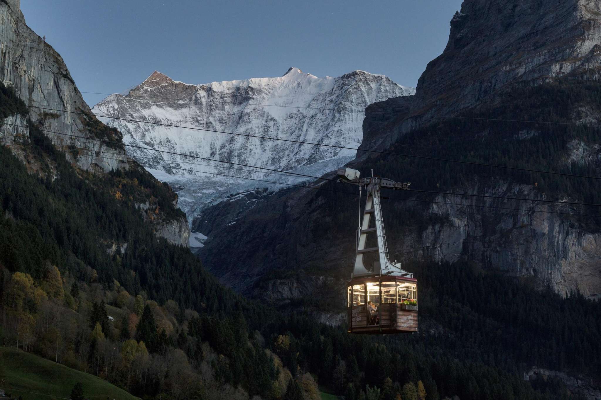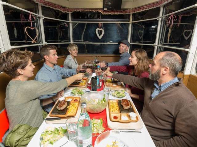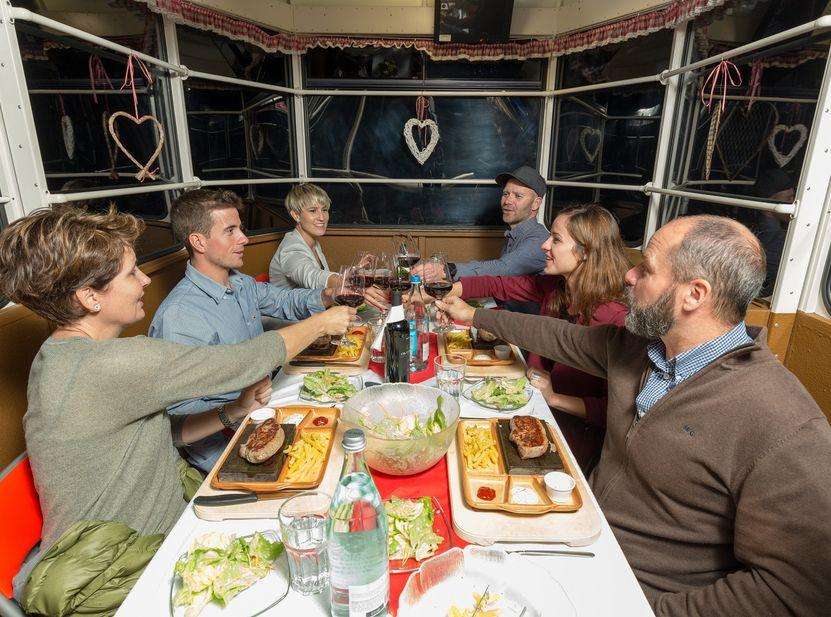 Les dîners dans le téléphérique de Pfingstegg sont une expérience unique de romantisme ferroviaire et d'idylle montagnarde. Après le retour à la station inférieure, nous te servirons le dessert avec du café et un digestif.