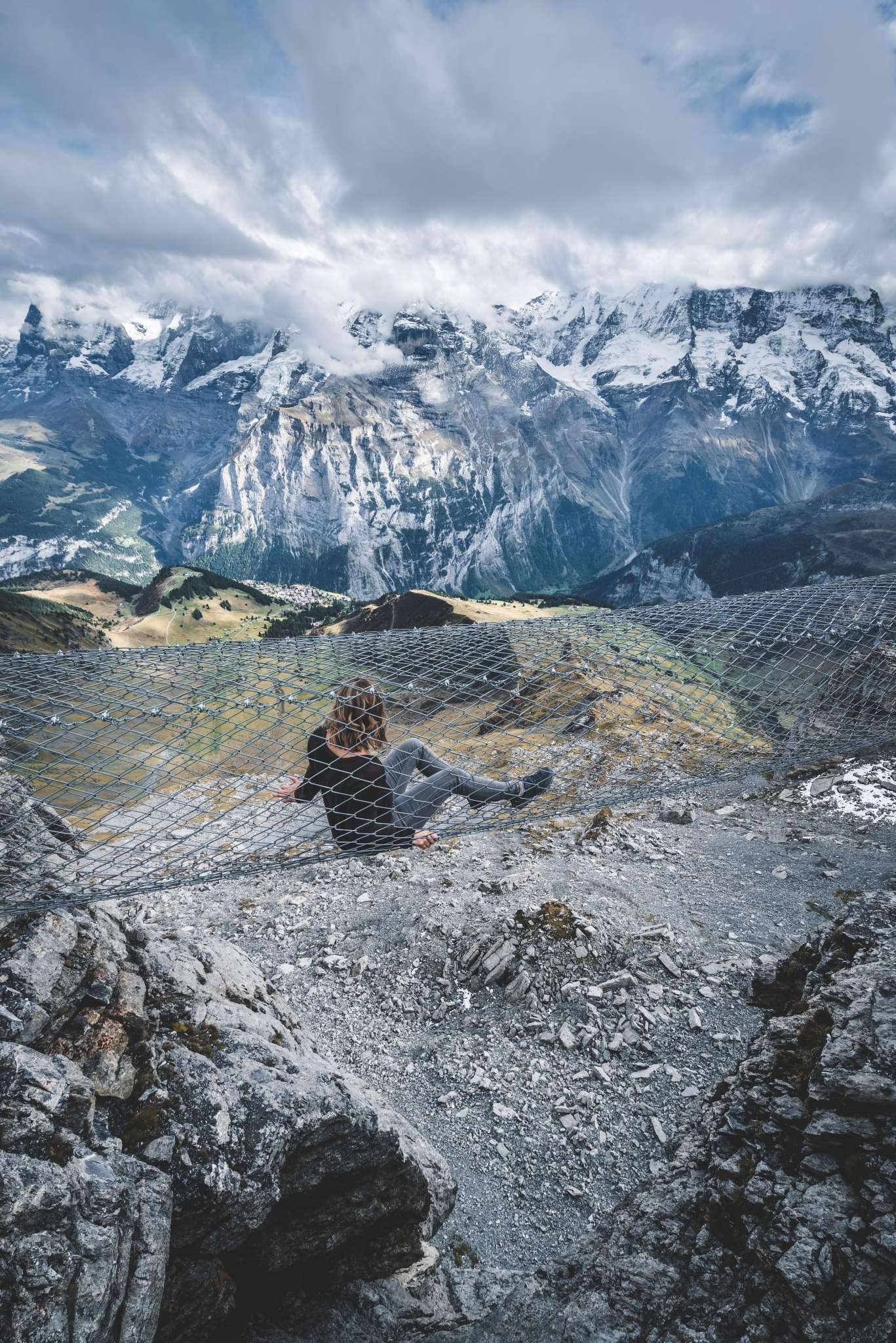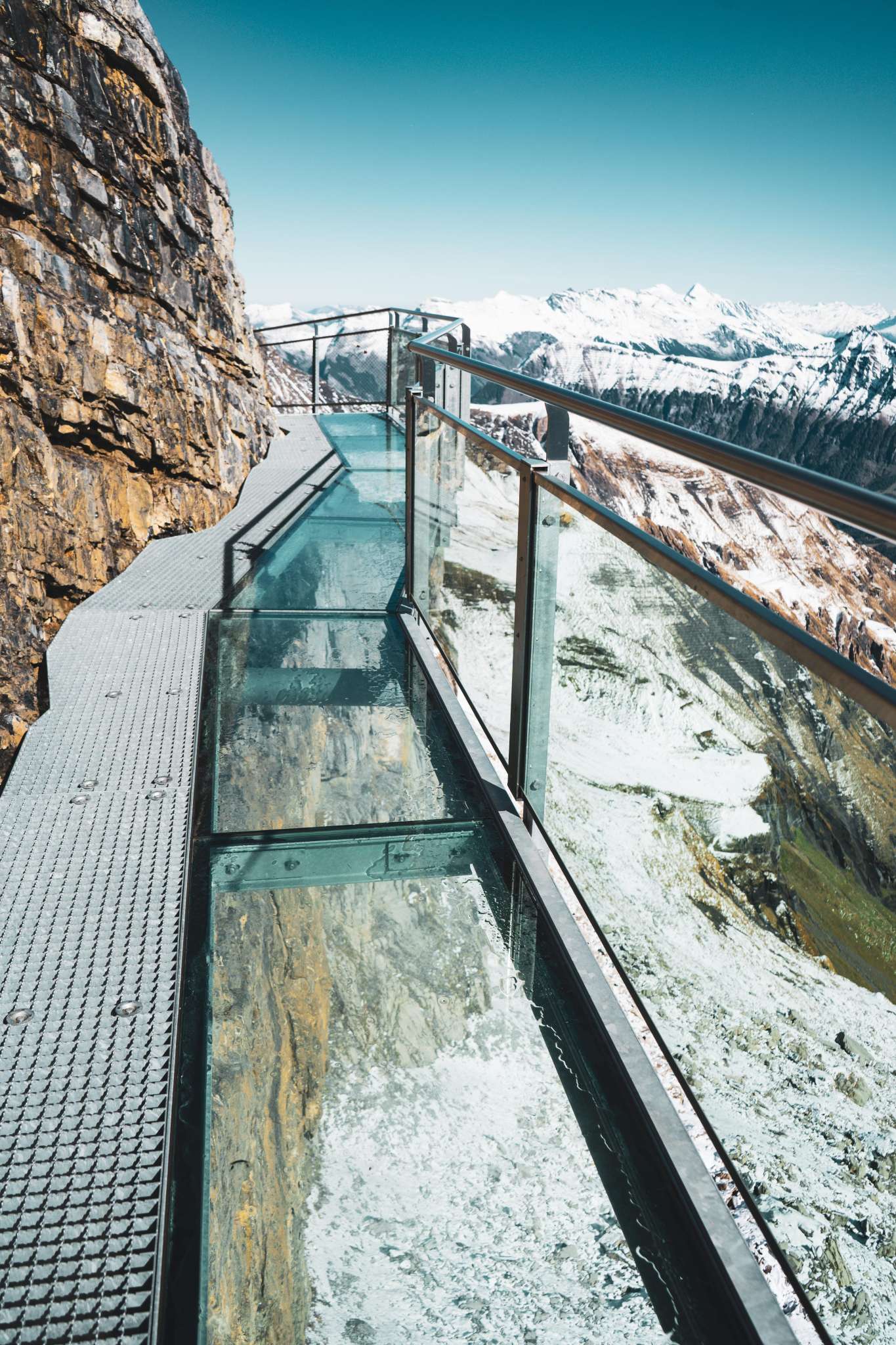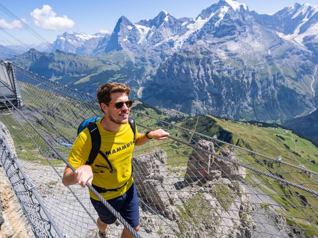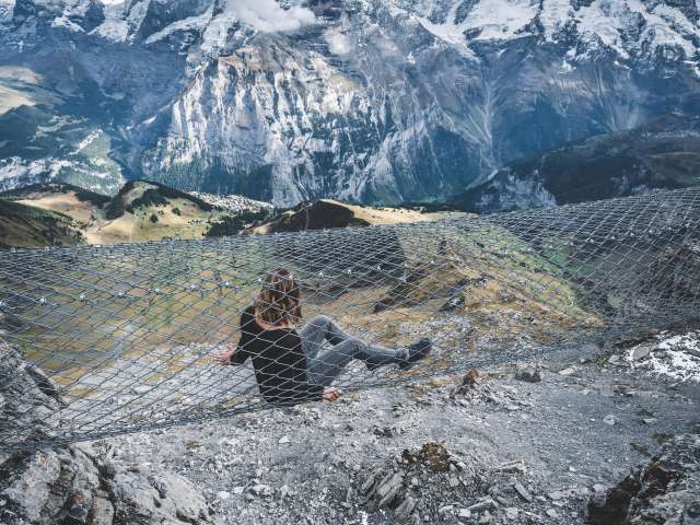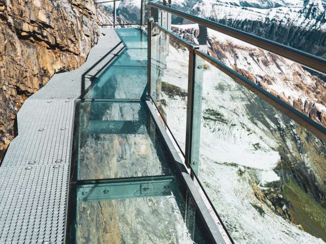 Si tu te diriges vers le Schilthorn depuis Mürren, tu arriveras à la station intermédiaire de Birg après le premier trajet en télécabine. Ici, tu devrais prévoir un arrêt plus long pour visiter le Thrill Walk. Il garantit à tous ceux qui osent le franchir un pouls plus élevé. La passerelle rocheuse d'environ 200 mètres de long a été construite dans la roche le long du gouffre vertical. La construction en acier et en verre ainsi qu'un sol en caillebotis, s'intègre parfaitement dans le paysage rocheux anguleux. Tu devrais consacrer environ 45 minutes à la visite du Thrill Walk, afin d'avoir suffisamment de temps pour prendre quelques photos spectaculaires. En plus du caillebotis dont la passerelle et les escaliers sont en grande partie constitués, il y a environ 20 mètres de sol en verre, des éléments de sol en caillebotis pour bétail et un pont de corde de neuf mètres de long avec filet de sécurité. Un tunnel rampant de huit mètres complète l'expérience. L'entrée du Thrill Walk se trouve du côté de la terrasse panoramique de la station Birg. Après les 200 mètres de sensations fortes, tu atteindras l'extrémité de la passerelle située plus bas. De là, un chemin de gravier (recouvert de neige en hiver) monte jusqu'au bâtiment de la station.